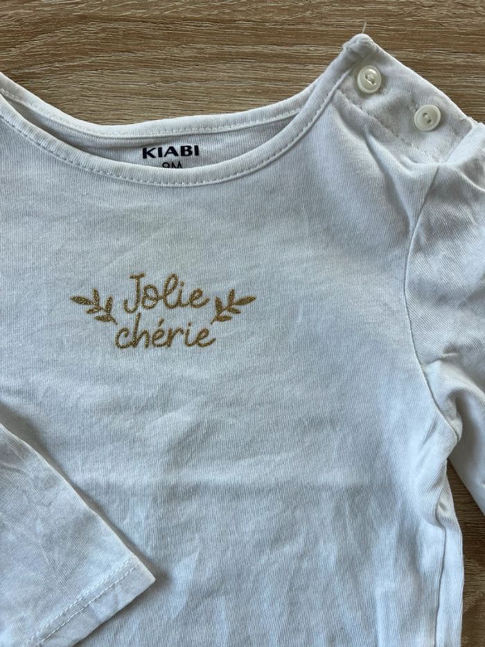 Joli t-shirt blanc avec écriture dorée « jolie chérie » 2 boutons au niveau d’un côté du cou pour ouvrir et fermer le t-shirt 9 mois / 69-72 cm #MMfille9mois