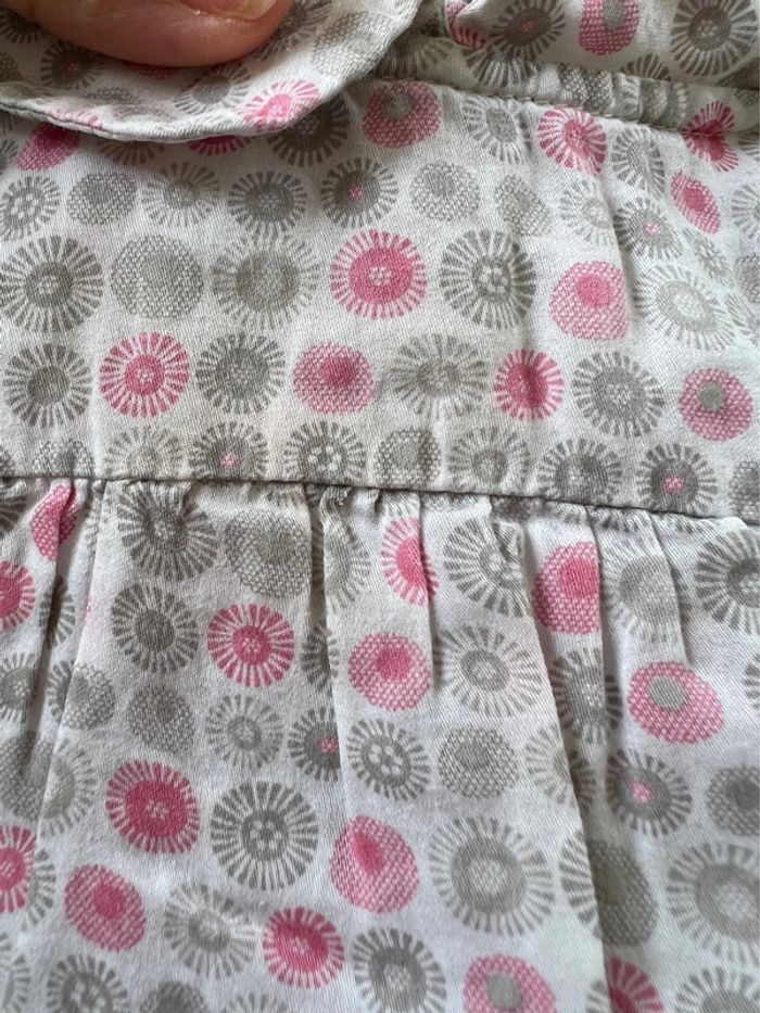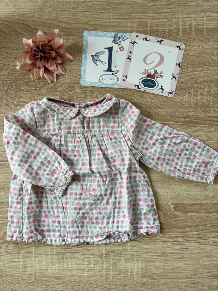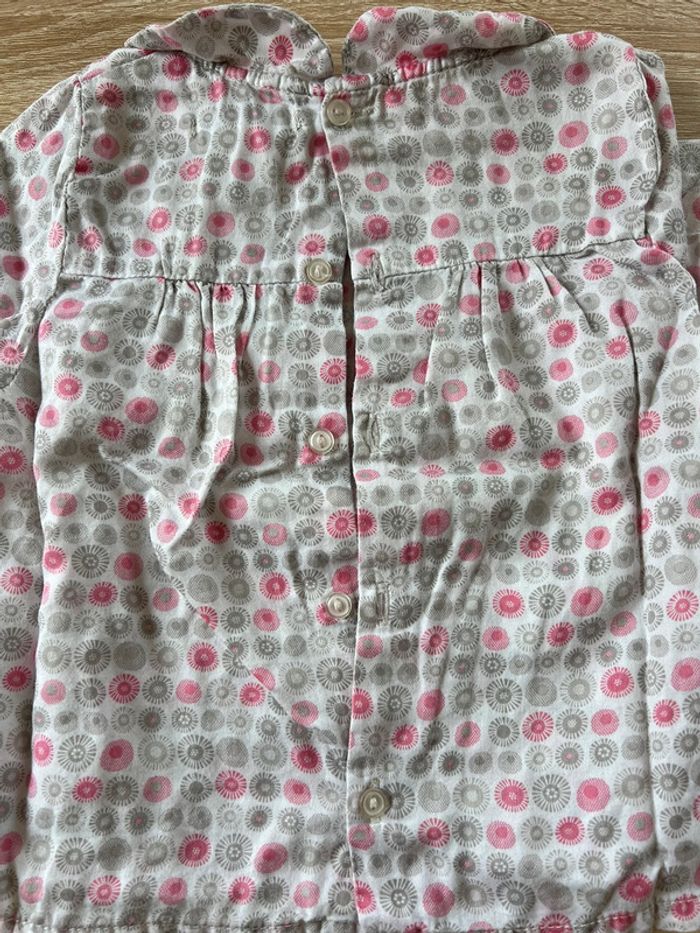 Joli chemisier blanc à motifs gris et roses Fermeture par pressions dans le dos 12 mois / 74 cm Légère tache sur l’avant, au niveau de la couture (cf photo 4) #MMfille12mois