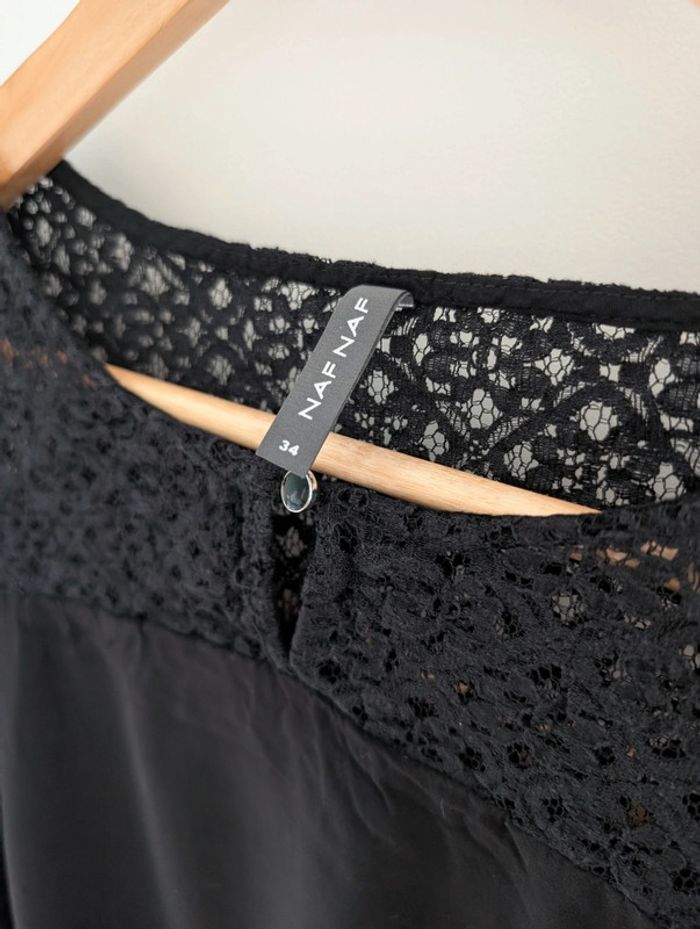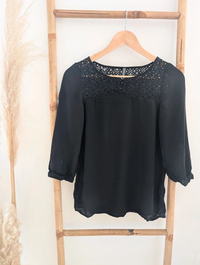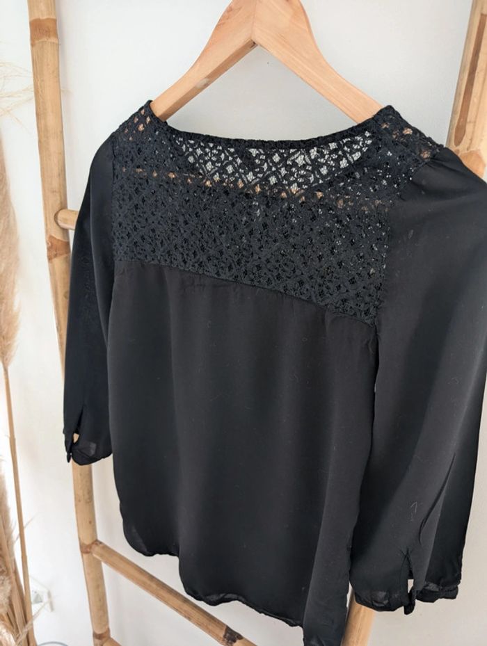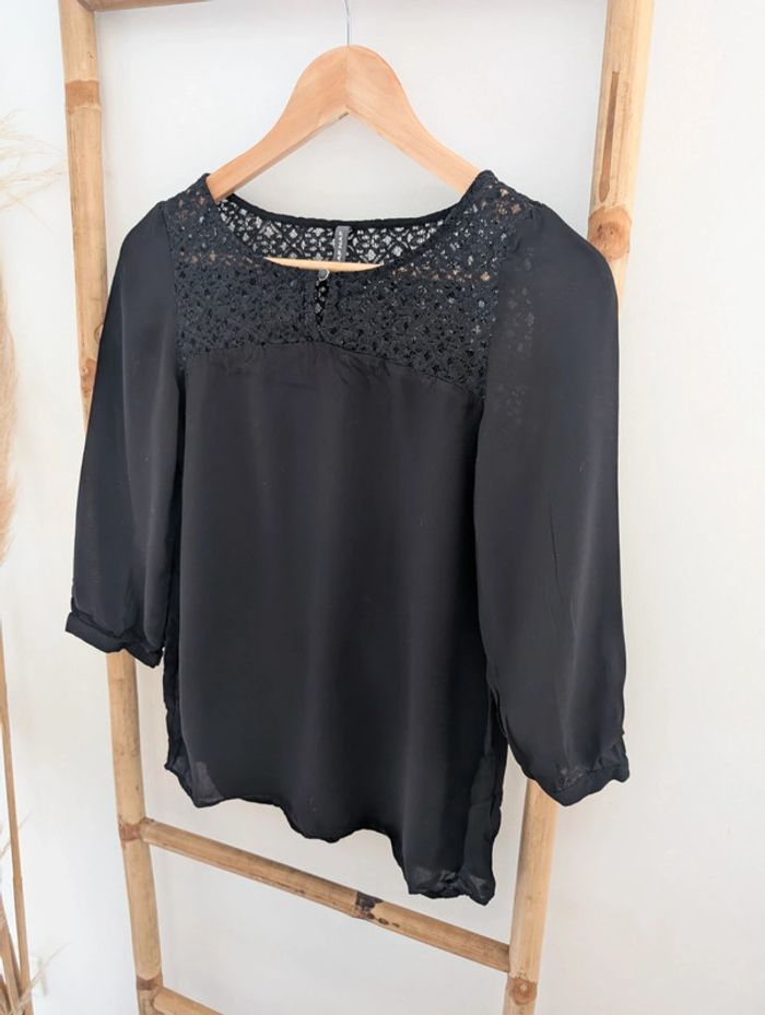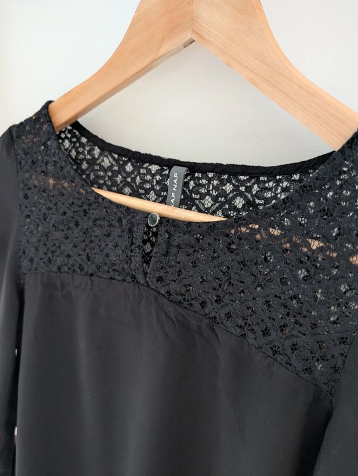 Joli chemisier noir manches 3/4 avec broderie sur le devant et haut du dos. Marque Naf Naf. Taille 34 Très bon état, porté une fois. #tennytebvetementsfemme #nafnaf