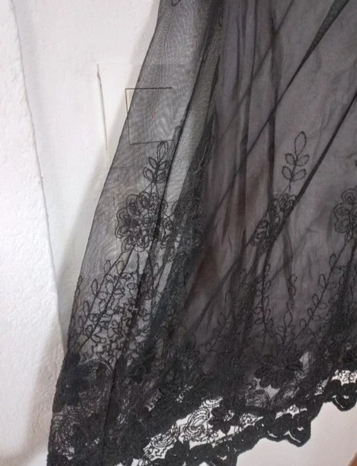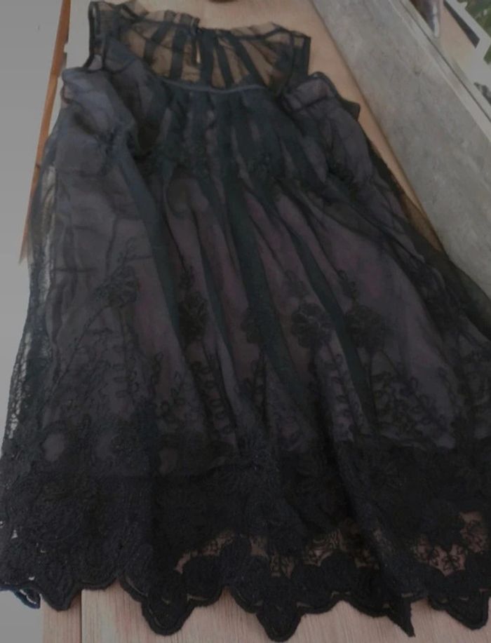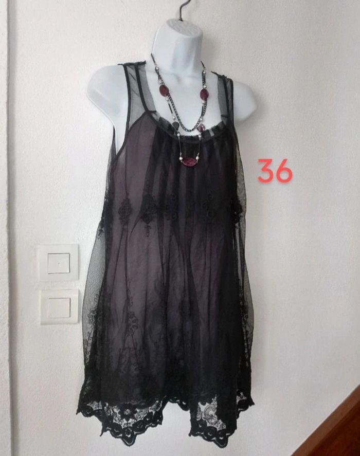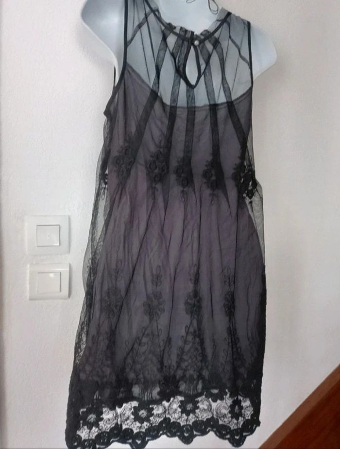 #patriciaponziotaille36 Robe courte cocktail dentelle Femme 36 . Aisselle a aisselle 42,5 cm. Couleur noir foncé. Longueur dos 78 cm. En très bon état. Doublure gris violet. Sans le collier.
