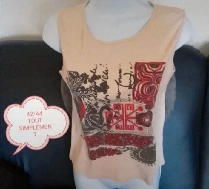 Très beau débardeur femme, taille 42/44. En très bon état Marque TOUT SIMPLEMENT. Couleur beige, motifs rouge foncé, gris foncé. #patriciaponziotaille44 #patriciaponziotaille42