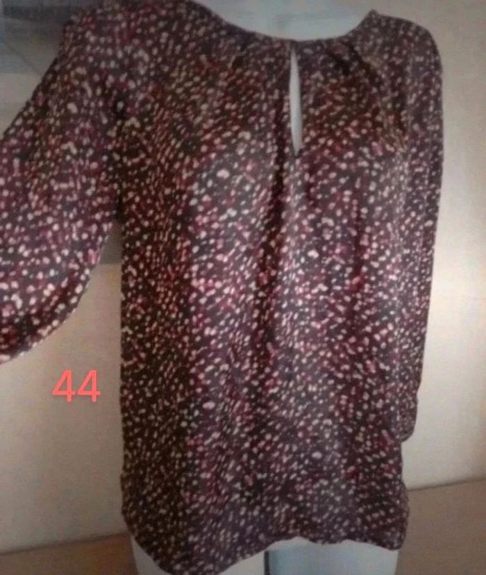 Superbe blouse fluide femme 44 Aisselle à aisselle 51 cm En excellent état. Tissu très doux. Couleur noir, rouge, beige. Marque FIDEOLIS. #patriciaponziotaille44 Longueur 52 cm
