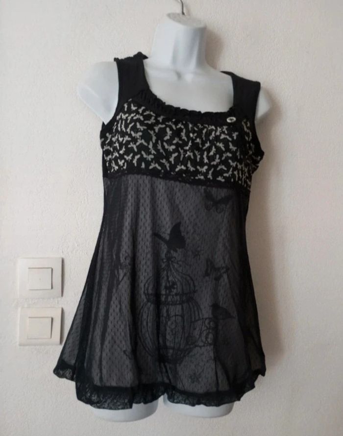 Haut en voile et coton femme 40 Aisselle à aisselle 46 cm Marque PROMOD. En très bon état Couleur noir, motifs blanc. Doublure blanche #patriciaponziotaille40 Longueur 64 cm