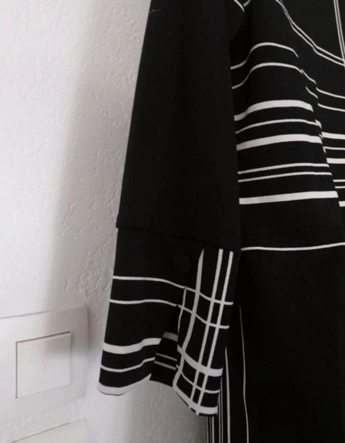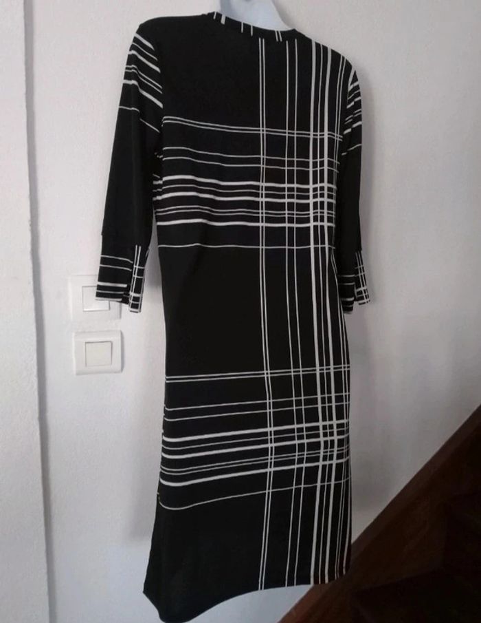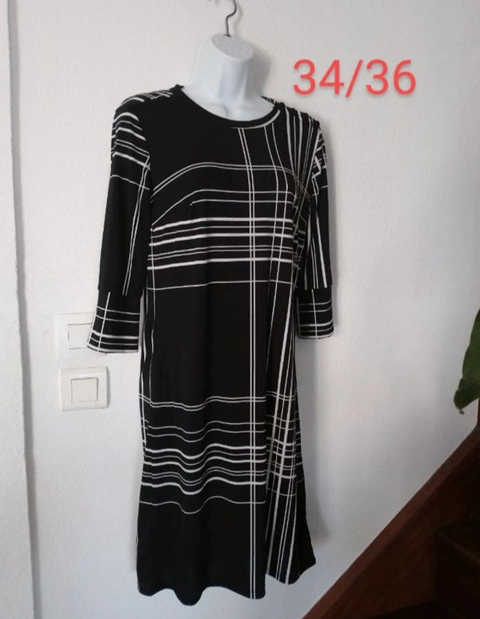 #patriciaponziotaille34 #patriciaponziotaille36 Superbe robe droite femme 34.36. Fluide. Manches 3/4. En excellent état comme neuve. Longueur 94 cm. Couleur noire blanc