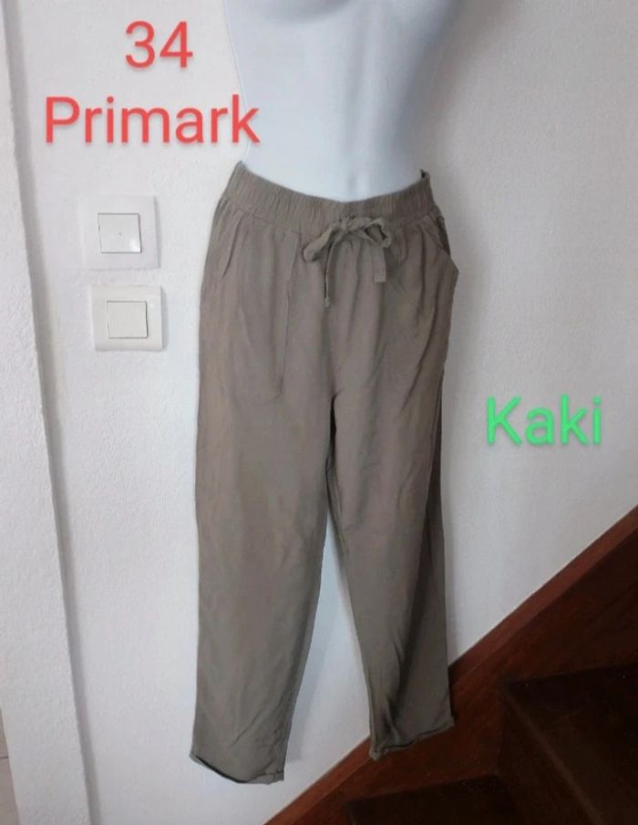 #patriciaponziotaille34 Pantalon léger femme taille 34 En excellent état comme neuf. Couleur kaki. Marque PRIMARK. Taille élastique et revers bas de jambe. Vous pouvez cliquer sur le lien ci-dessus pour voir tout mon 34
