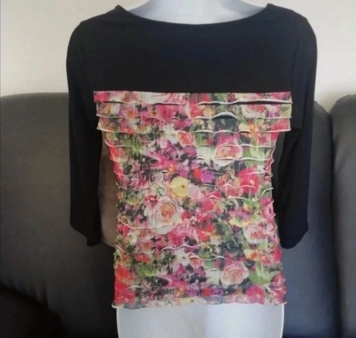 Superbe haut femme taille 38, Avec légers petits volants fleuris. Couleur multicolore, fond noir. En excellent état. Manches 3/4. Vous pouvez cliquer sur le lien ci-dessous pour voir tout mon 38 #patriciaponziotaille38