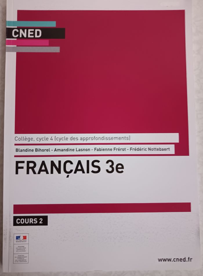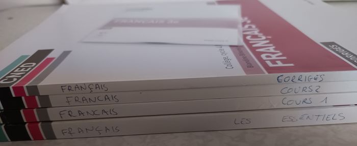 Lot Complet de 5 articles CNED pour collège 3ème pour la matière Français comprenant : Les essentiels Cours 1 Cours 2 Les Corrigés CD Audio Les articles sont en très bon état général .