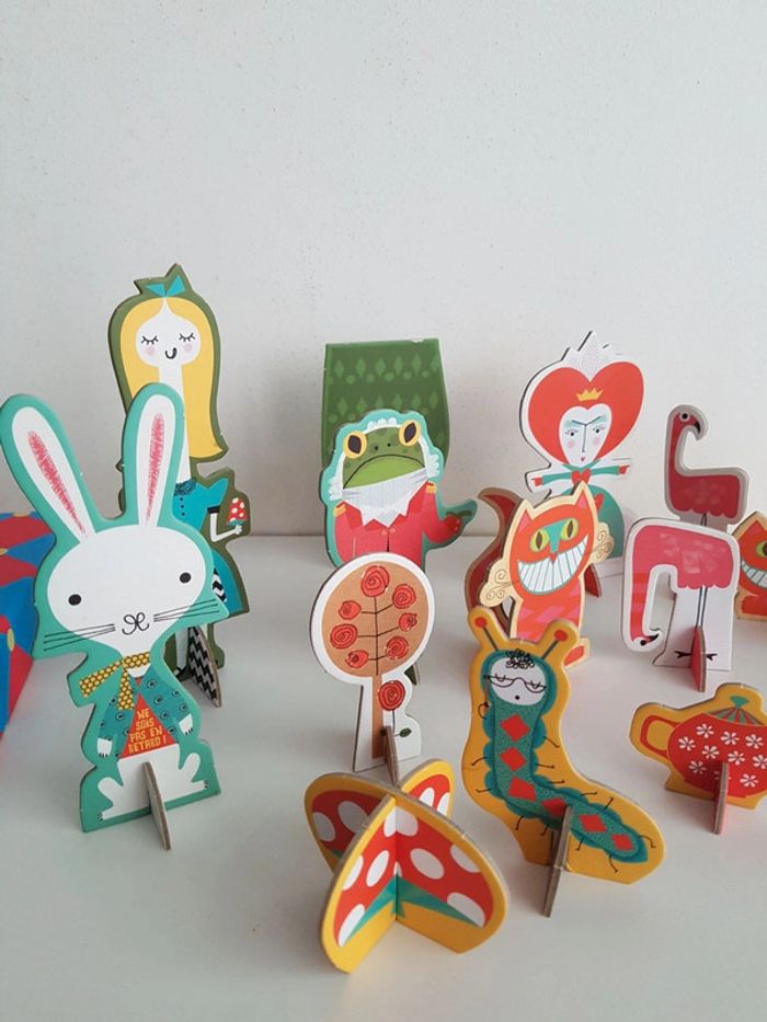 Un playset en carton pour former arbre, théière, flamand rose, lapin, Reine de cœur...