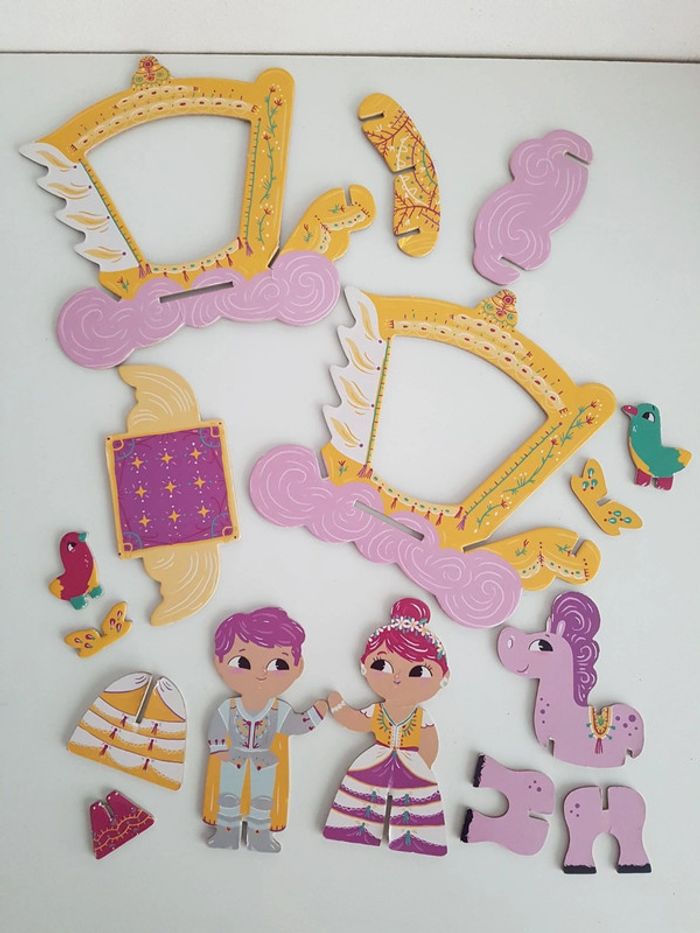 • pièces en carton à assembler pour former carosse, cheval, princesse et prince