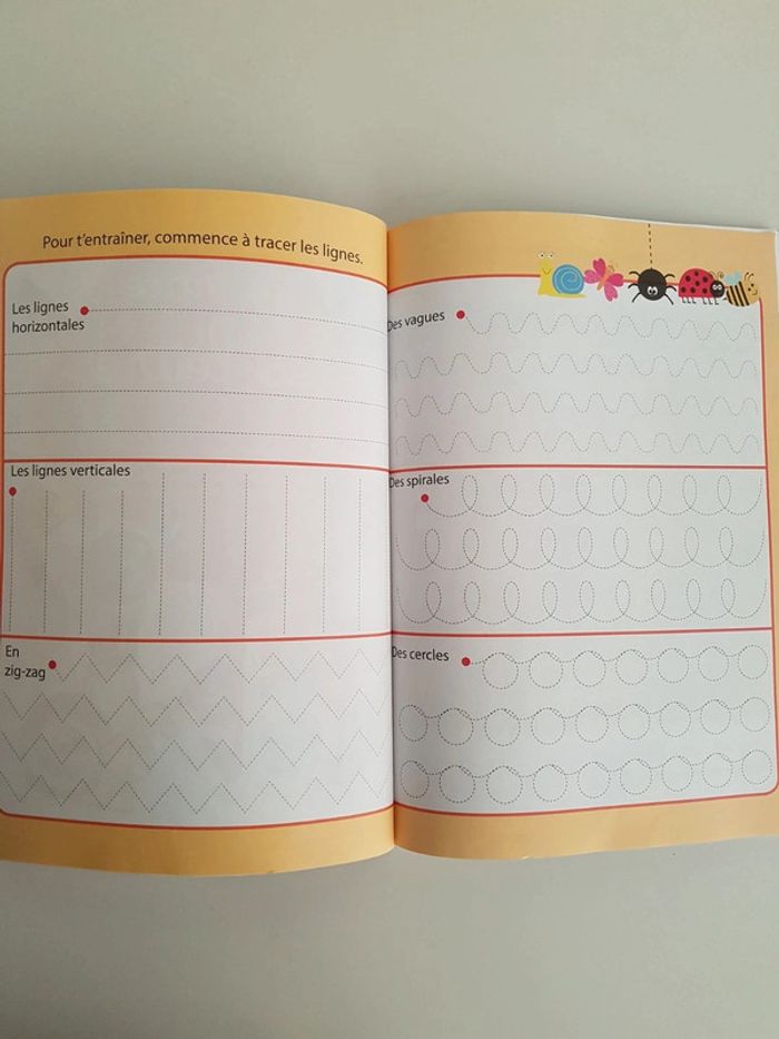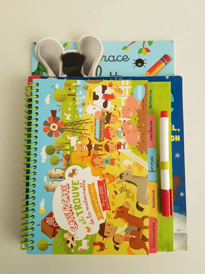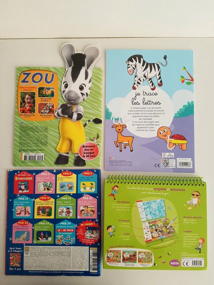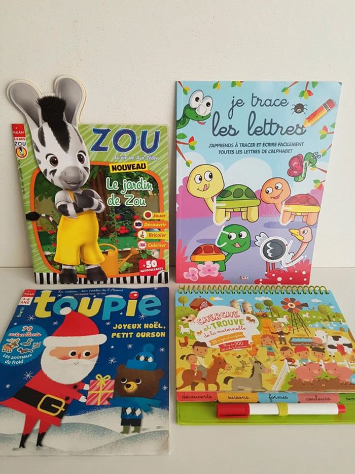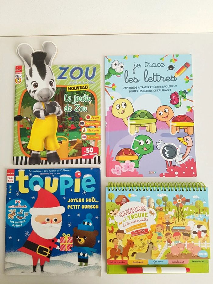 Lot de 4 livres d'activités destinés aux enfants de 3 à 6 ans • Cherche et trouve de la maternelle, Auzou 25 pages plastifiées, plus de 200 détails à trouver pour découvrir les saisons, les formes, les couleurs, les jours de la semaine Dimensions : 23 × 19 cm • Zou La vie de A à Zèbre numéro 2 Le jardin de Zou Avec 50 autocollants • Toupie, Joyeux Noël Petit ourson 1 jeu est déjà fait, album usé • Je trace les lettres avec les animaux Pour apprendre à tracer et écrire facilement toutes les lettres de l'alphabet en attaché Dimensions : 21 × 29,5 cm