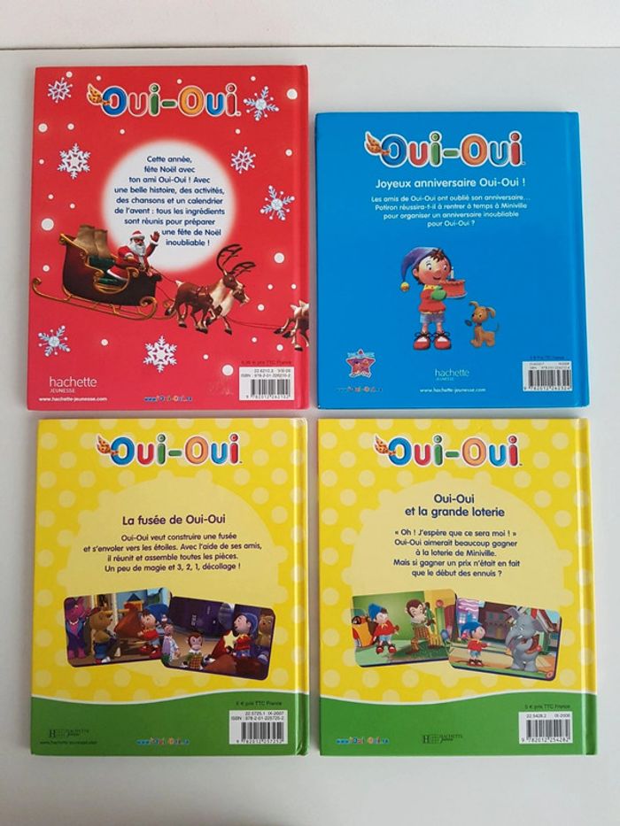 Lot de 8 livres du héros des dessins animés Oui-oui, le chauffeur de taxi avec son bonnet bleu à grelot et son foulard jaune à pois rouges. Des aventures colorées et joyeuses pour découvrir ses amis : Potiron, Mirou, Souriceau, Monsieur le Gendarme, Monsieur Culbuto, Bouboule l'ourson ou Zim le chien. Certaines couvertures sont usées. Éditions Hachette jeunesse • Joyeux Noël, Oui-oui! Une histoire, des activités, un calendrier de l'avent Le garçon assiste le père-noël et son traîneau tiré par les rennes pour la distribution des cadeaux. Dimensions : 20,5 × 26 cm • Oui-oui et la grande loterie C'est l'agitation à Miniville. • Oui-oui et la cornemuse enchantée • Oui-oui perd son grelot Couverture souple Vu à la télé Oui-oui au pays des jouets Dimensions : 19 × 23 cm • Oui-oui et le concours de gâteaux • Oui-oui et les lutins Couverture souple très abîmée • Joyeux anniversaire Oui-Oui ! Des pages sont abîmées Dimensions : 19,5 × 22 cm • La fusée de Oui oui Livre en cadeau, très abîmé