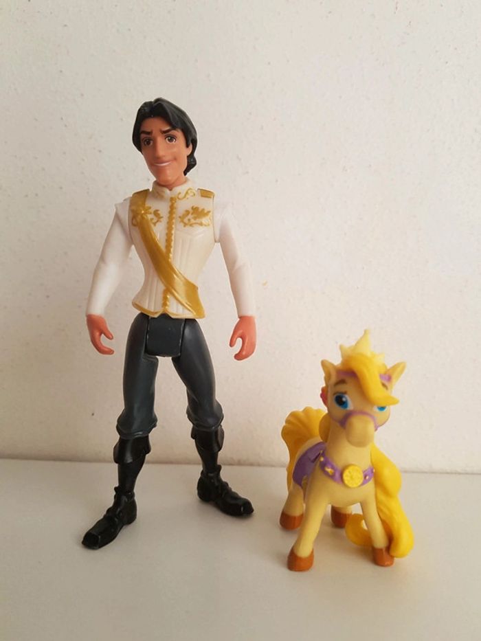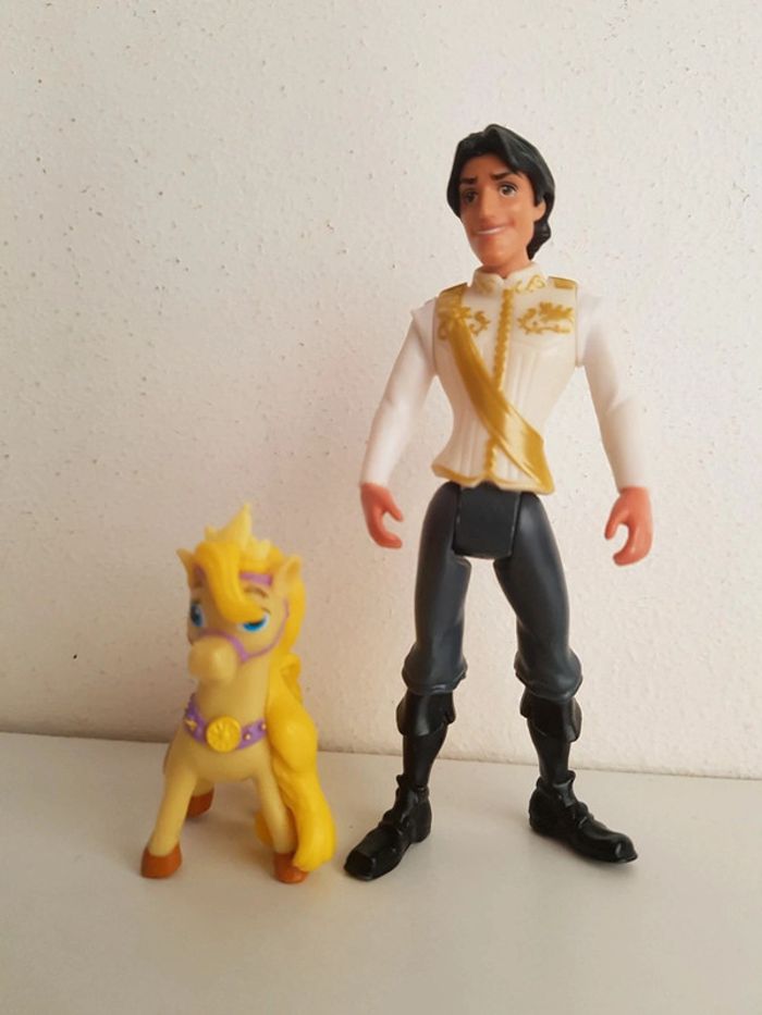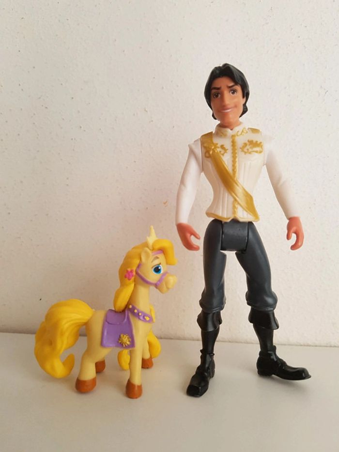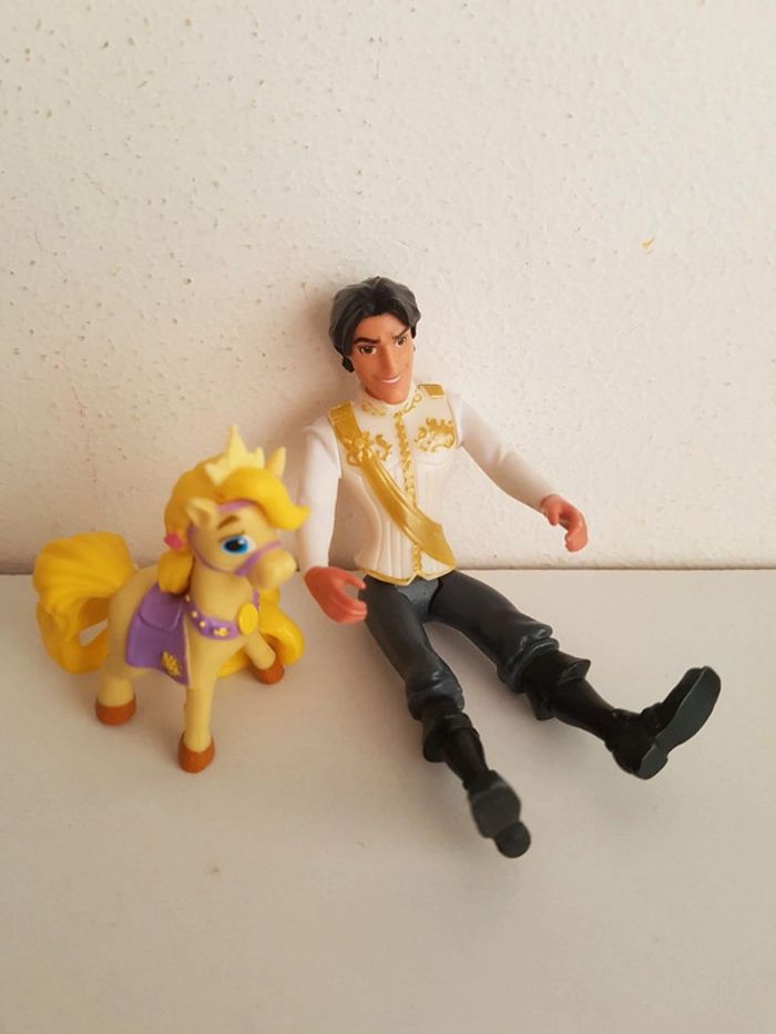 Lot de 3 figurines issues des dessins animés de Walt Disney • Raiponce ou Rapunzel, la princesse à la longue chevelure blonde, avec sa robe violette et Pascal le caméléon sur son épaule, les pieds sont usés, marque Bullyland, hauteur 10 cm • Flynn Rider ou Eugène, bras et jambes articulés, hauteur 10 cm • Maximus, cheval de la garde royale, de la collection Disney palace pets, hauteur 5 cm