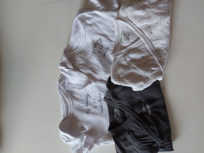 Lot bodies manches courtes Kiabi taille 3 mois. Portés quelques fois mais encore en très bon état.