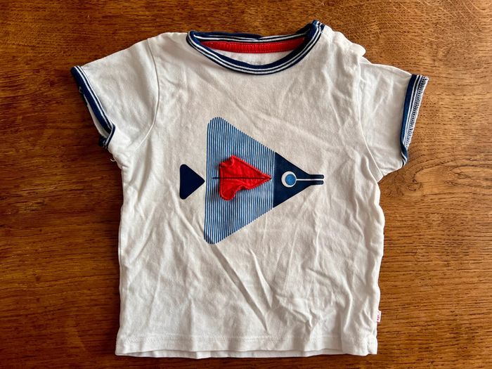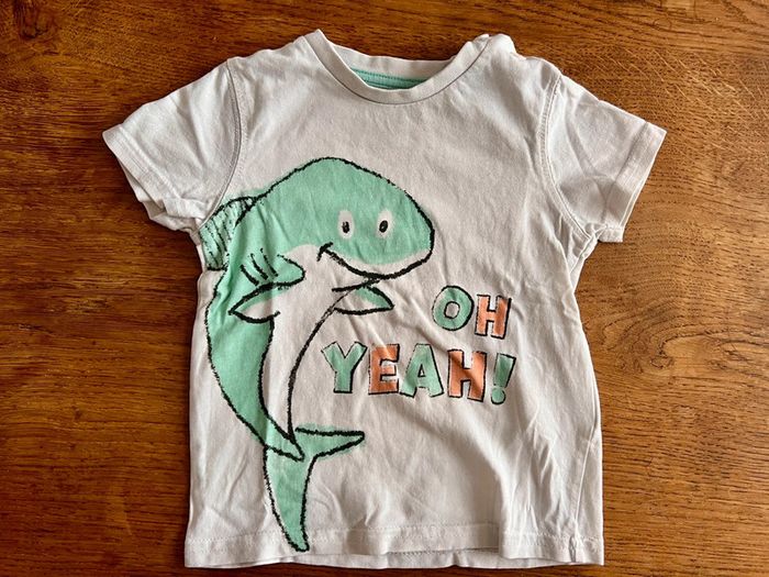 Articles d’occasion. Tendre maman porté 1 fois mais légère tache au niveau de l’aisselle (peu visible voir photo). Teeshirt requin marque gemo. Teeshirt poisson m’arque Obaïbi