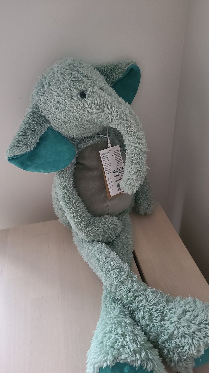 Grand éléphant à la fourrure bleue claire toute douce. L’animal imposant de la savane se transforme en poupée tendre câline Grand éléphant Les Baba-Bou moulin roty