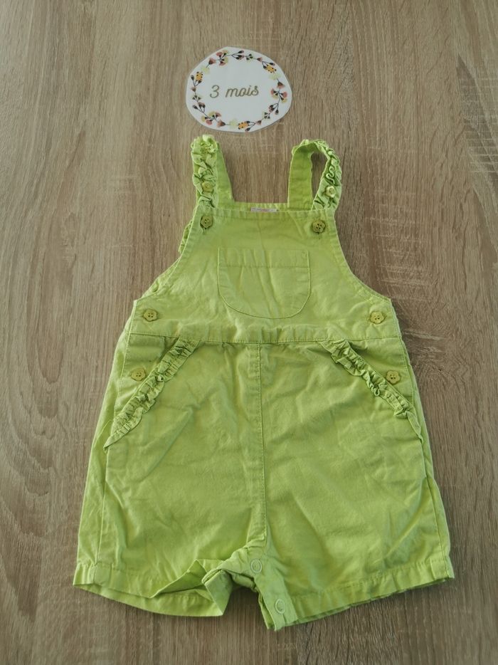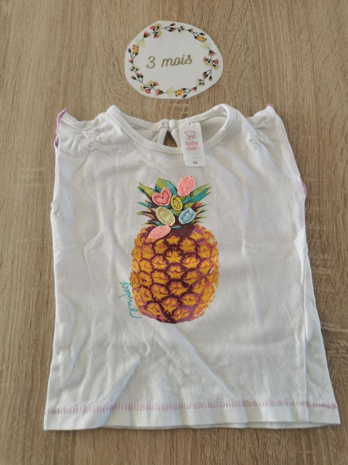 Lot d'été pour fille en taille 3 mois: ✅1 robe orchestra en tres bon etat ✅1 salopette dpam en très bon état mais un defaut au niveau d'une pression mais ne gêne en rien pour la porter ✅1 tshirt manches courtes motifs ananas baby club