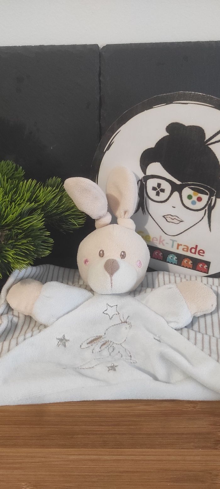 Doudou lapin bleu nicotoy simba toys kiabi marron beige rayé rayure étoile noeud