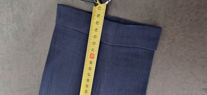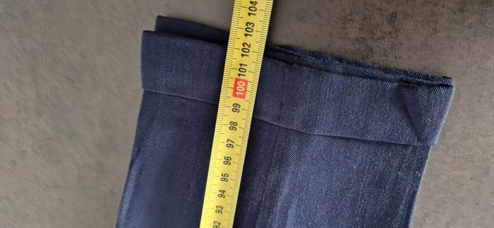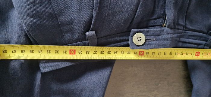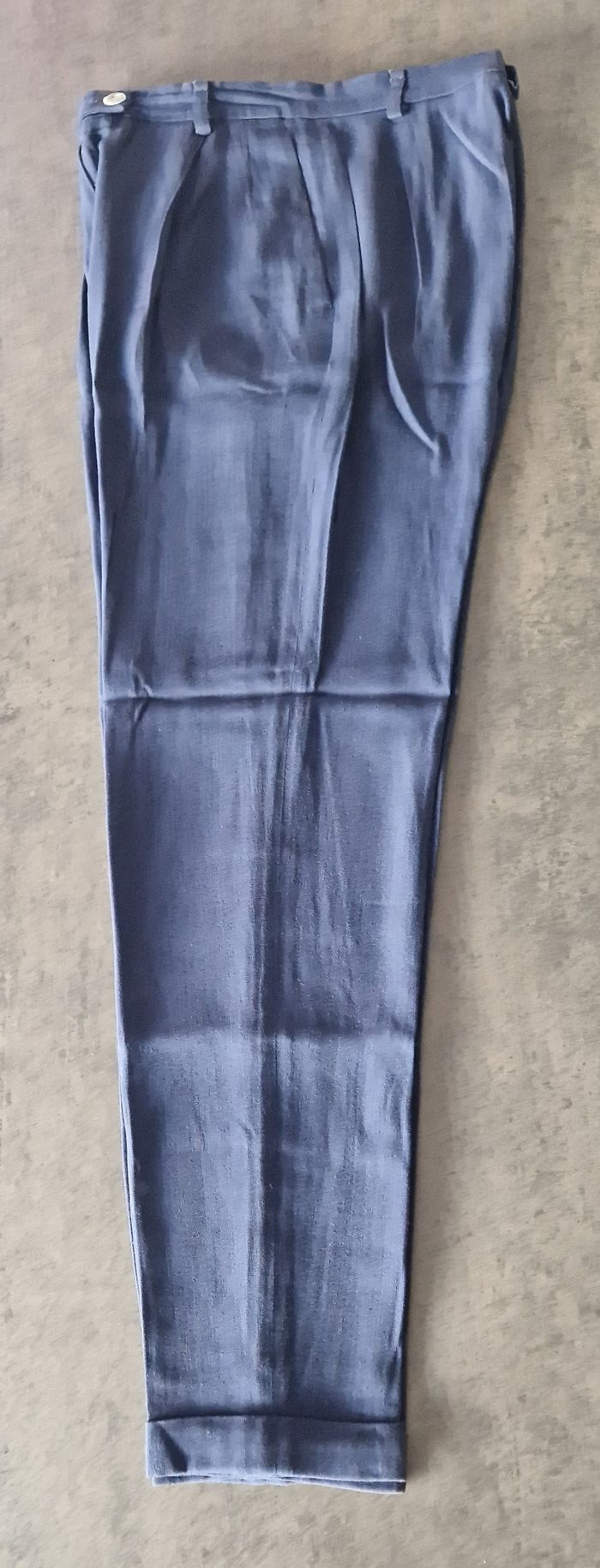 Pantalon du styliste allemand Klaus Thierschmidt, coupe carotte, bleu, à revers de 3 cm, entièrement doublé, poches sur les côtés Fermeture par glissière + double boutonnage / Fluide et agréable à porter Composition : 55% laine vierge / 40% Viscose / 5% Polyamide - doublure 100% acétate Taille M / 38 (36 allemande) : taille à plat : 34,5 cm - longueur entrejambe : 76 cm - longueur totale : 102 cm Excellent état, comme neuf, y compris la doublure, impeccable. Veste assortie disponible pour composer le tailleur également en ligne.