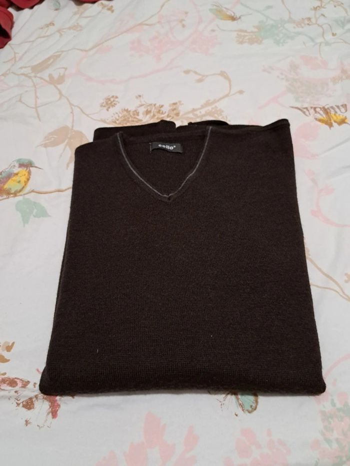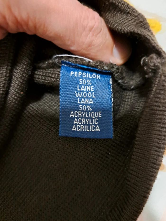 Beau pull de demi saison ou à porter sous blouson, Celio marron col V assez prêt du corps. Ce doit du M, je fais 180cm pour 68 kgs et je ne suis pas ridicule avec. Attention ce n'est pas un pull de ski non plus. 50% laine 50% acrylique