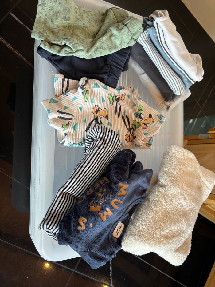 1 ensemble 1-2 mois h&m 6 bodis 3 mois petit bateau et obaibi 2 pyjama 3 mois tape à l’œil 2 short 3 mois tape à l’œil 1 ensemble 3-6 mois primark (t-shirt short) Le tout en parfait état