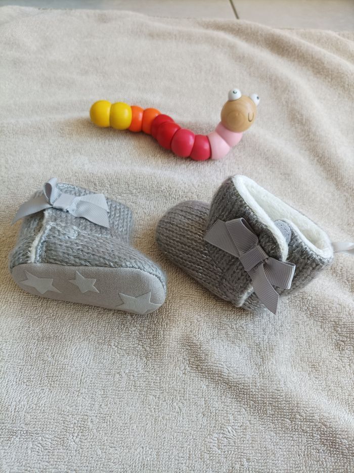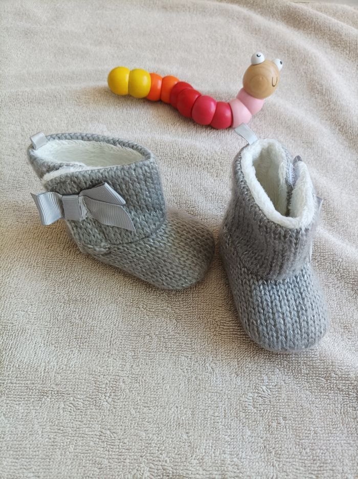 Petites bottines grises en tricot gris fils métallisé. Intérieur fourré bien chaud. Petit noeud sur le côté. Ouverture par un velcro sur le côté. Semelle tissu avec des étoiles antidérapantes. Neuves, il y a encore le papier a l'intérieur. Correspond à une taille 3-6 mois soit 16 - 17 en pointure.