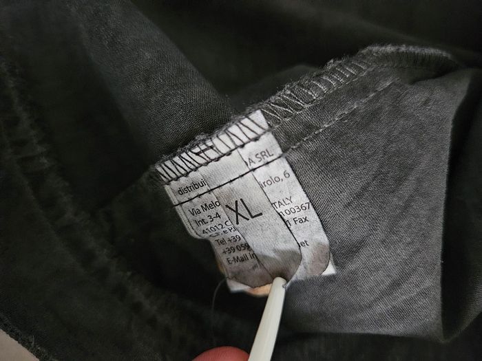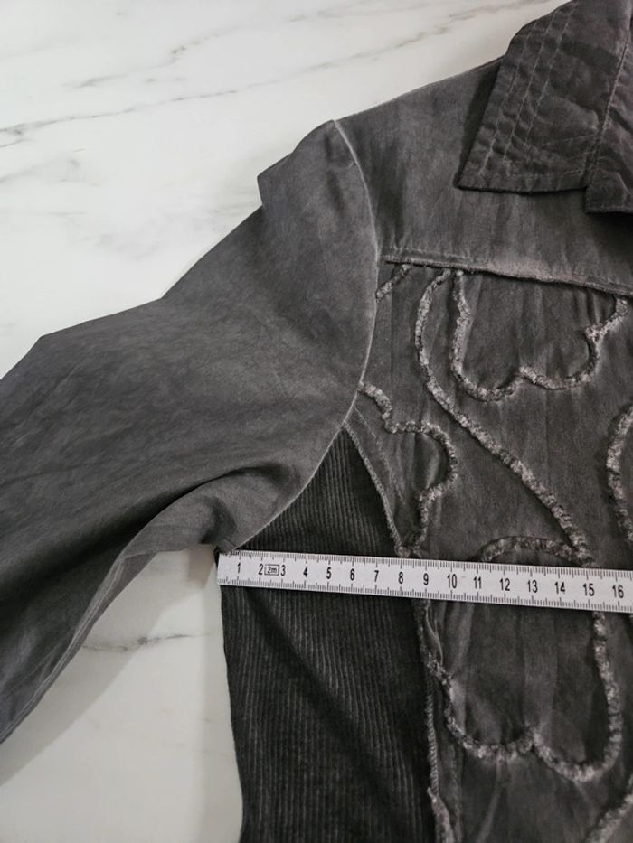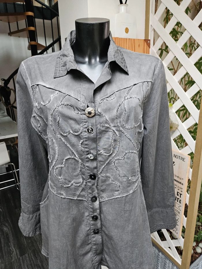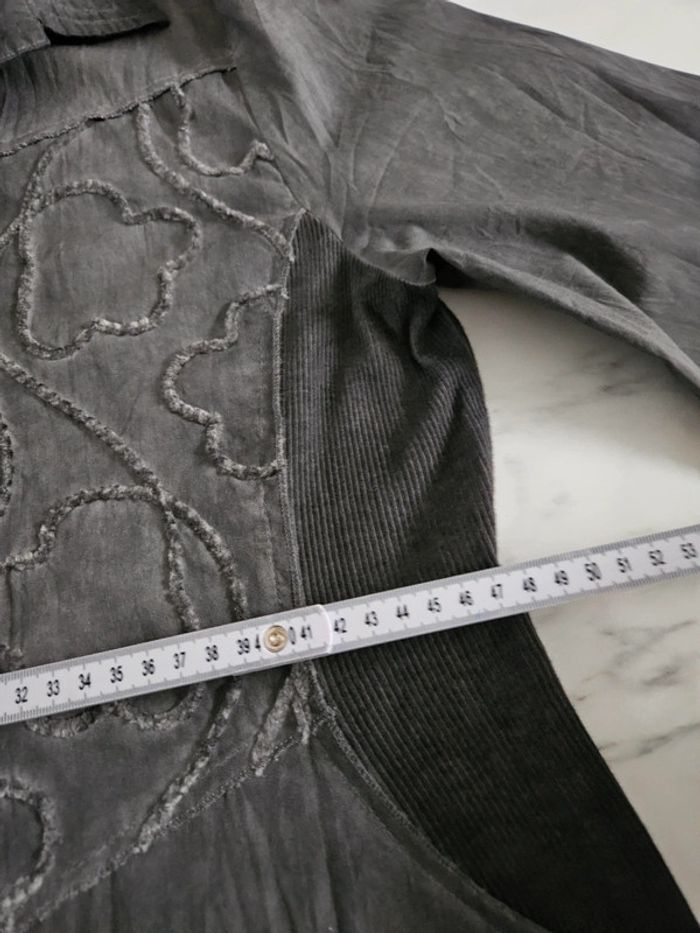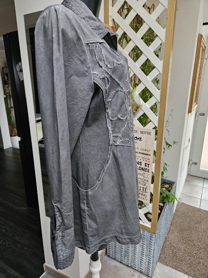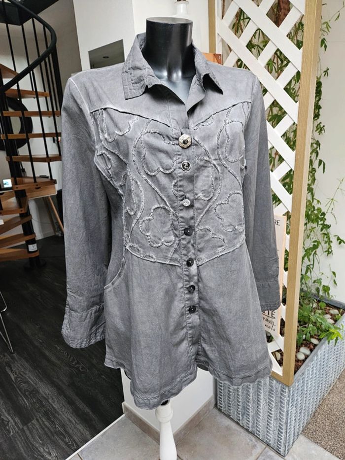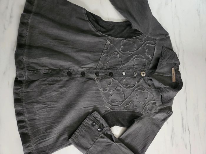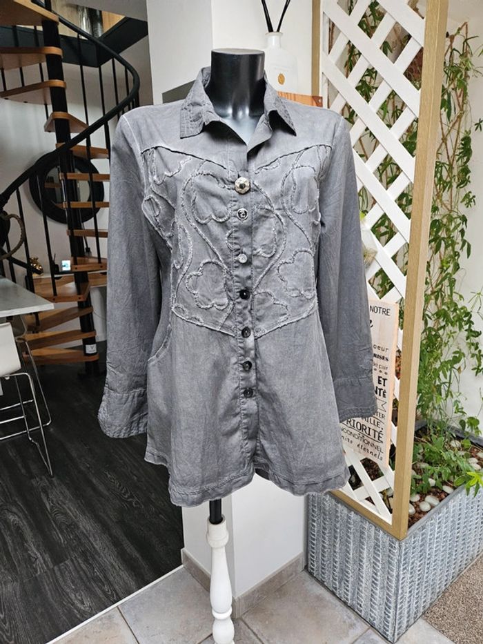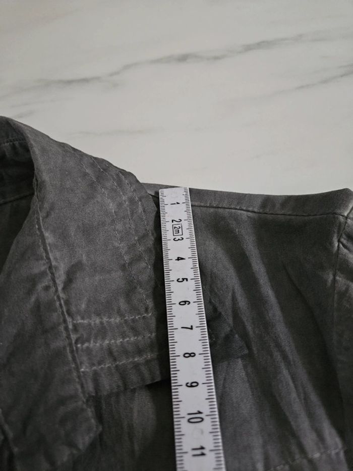 De couleur grise comme la chemise à plat. Elle peut faire office de veste légère. Elle est en parfait état. Extensible au niveau de côtés. Bas évasé. Dimensions sur les photos