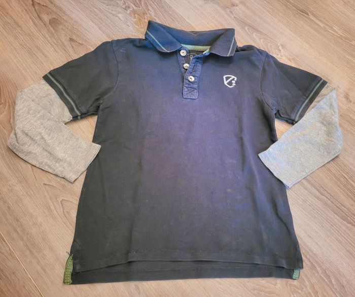 Polo bleu foncé manches longues grise s marque Okaidy 8 ans