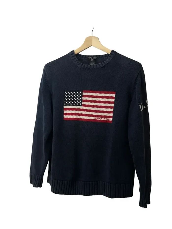 Pull col rond ralph lauren bleu marine logo drapeau USA flag taille M 6A - photo numéro 1