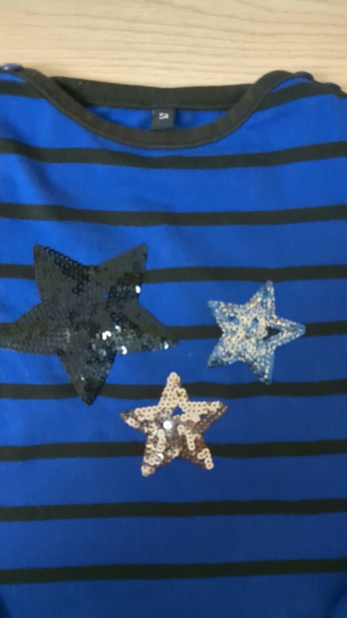 T-shirt rayé avec des étoiles en sequins. Boutons sur les épaules pour l'ouverture.