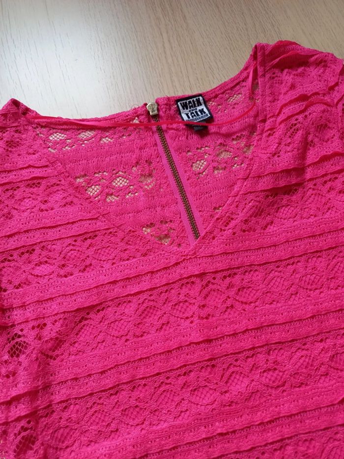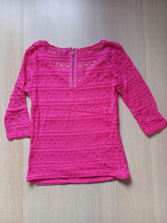 Haut en dentelle rose, transparent aux manches et à l'arrière, non transparent sur l'avant (doublure opaque). Manches 3/4. En excellent état, peu porté.