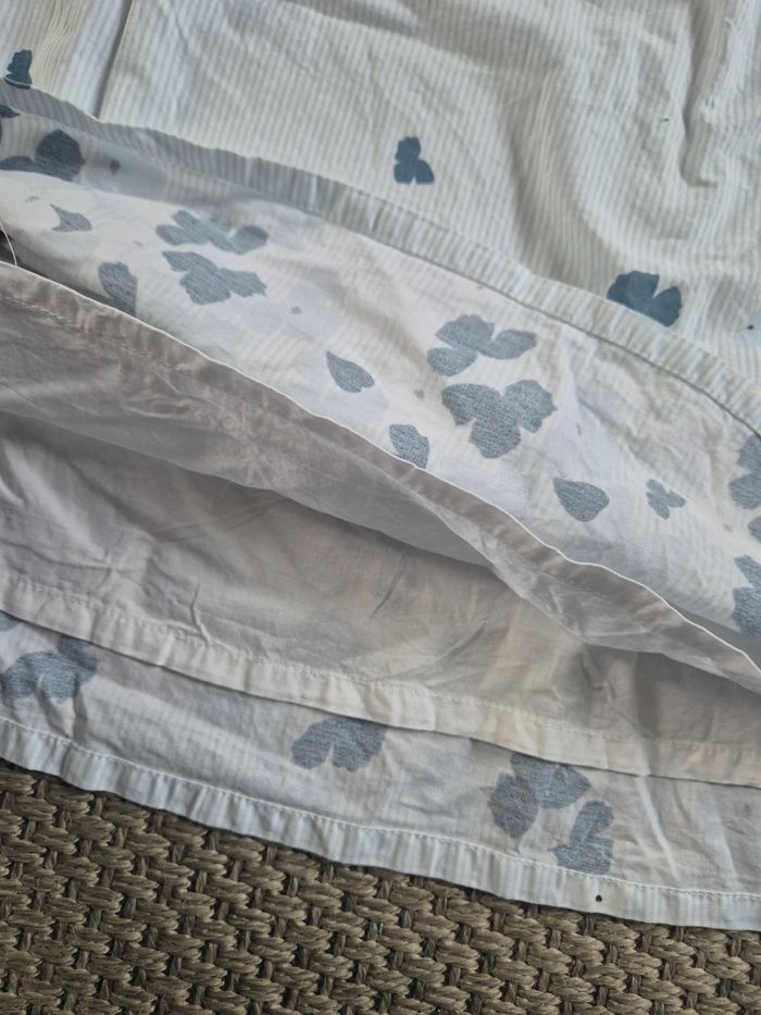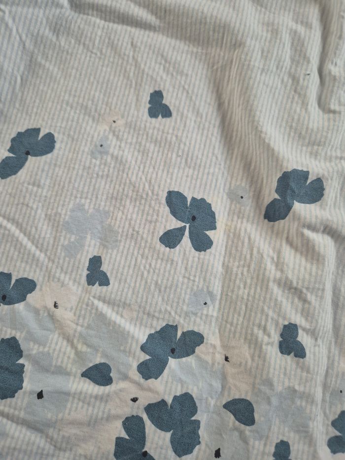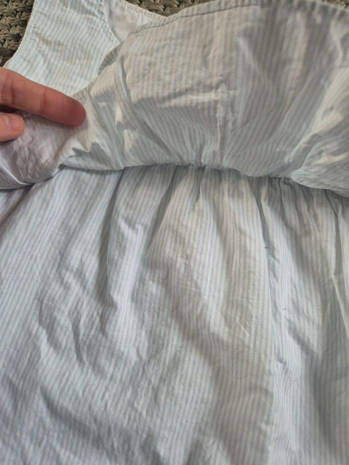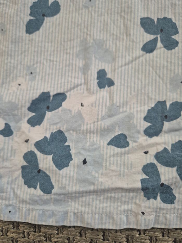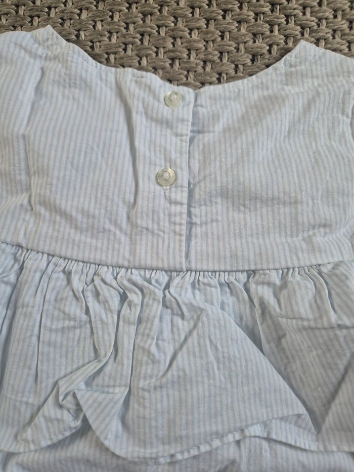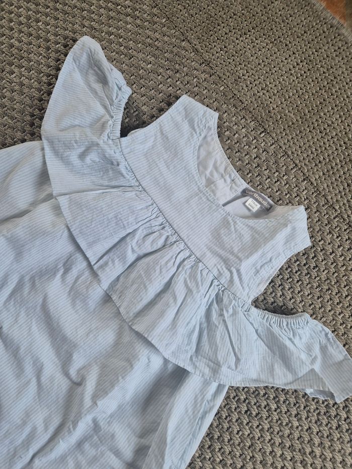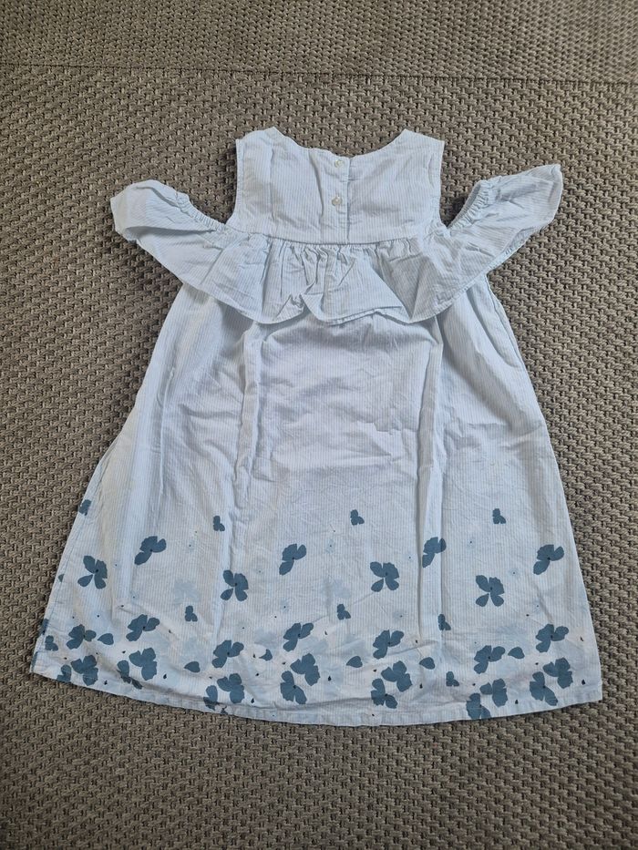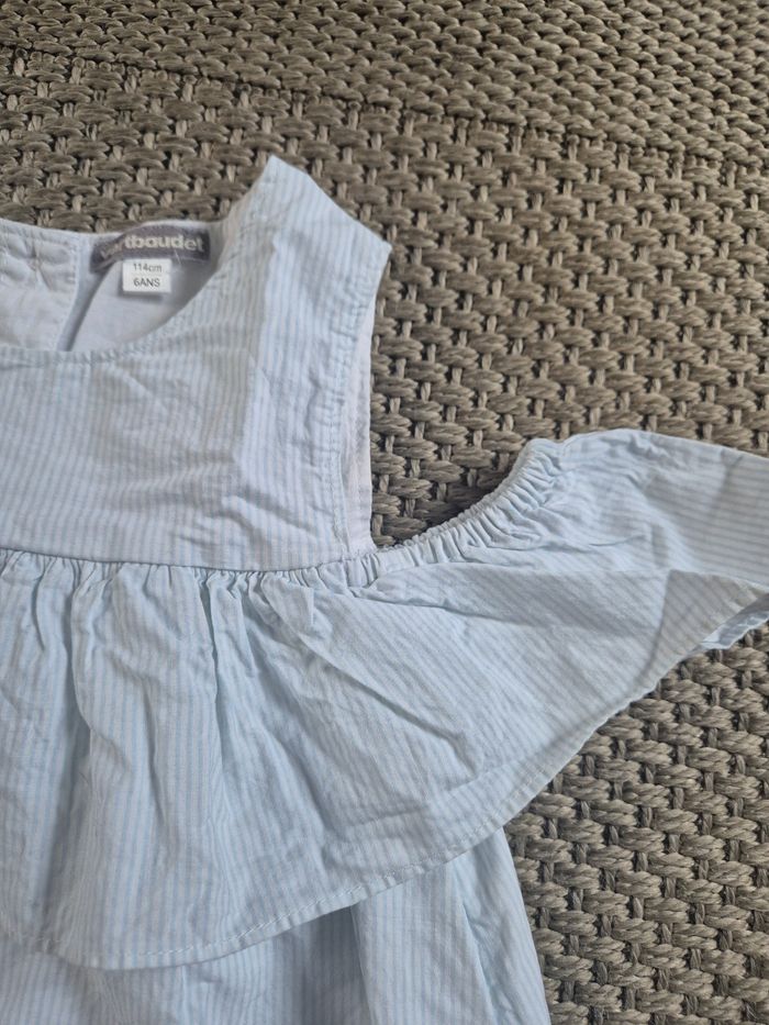 Robe de cérémonie avec légère rayures et fleurs bleue. Portée 2 fois elle est comme neuve. Jolie effet sur les épaules avec le volant. Idéal pour les occasions, anniversaire, mariage ou même tout les jours.