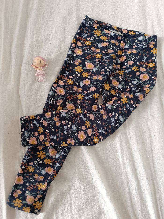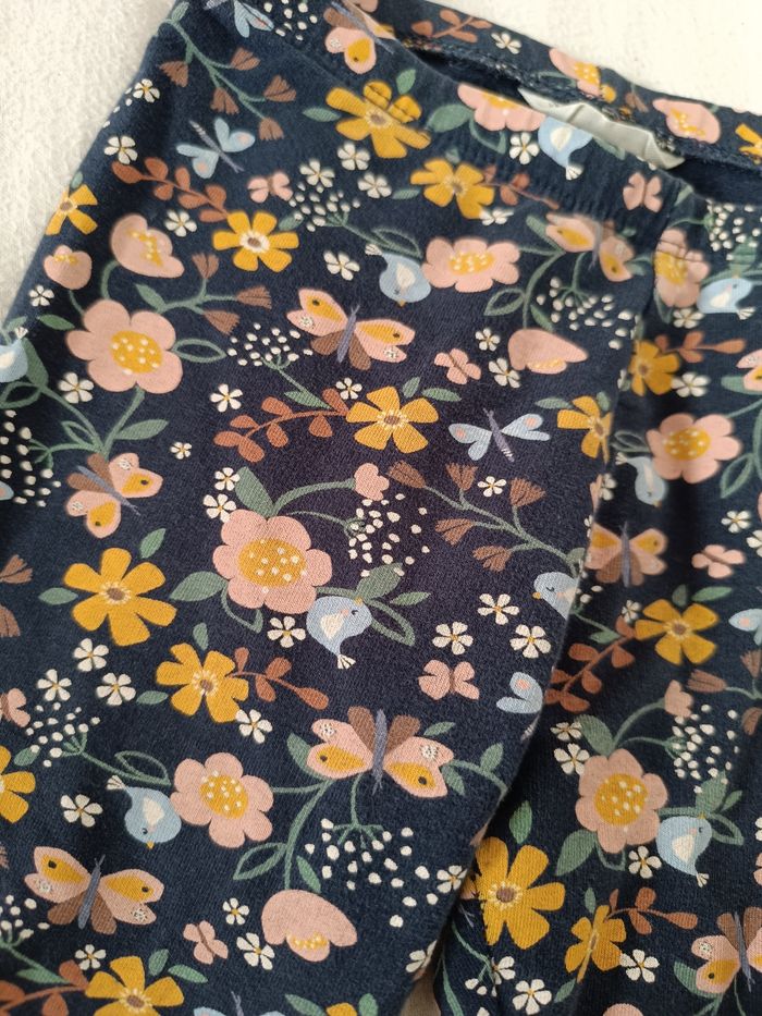Legging bleu marine aux motifs fleuris dans les tons rose, moutarde et bleu ciel. Taille élastique. Porté mais encore en très bon état (ni trou, ni tache). Taille 116cm