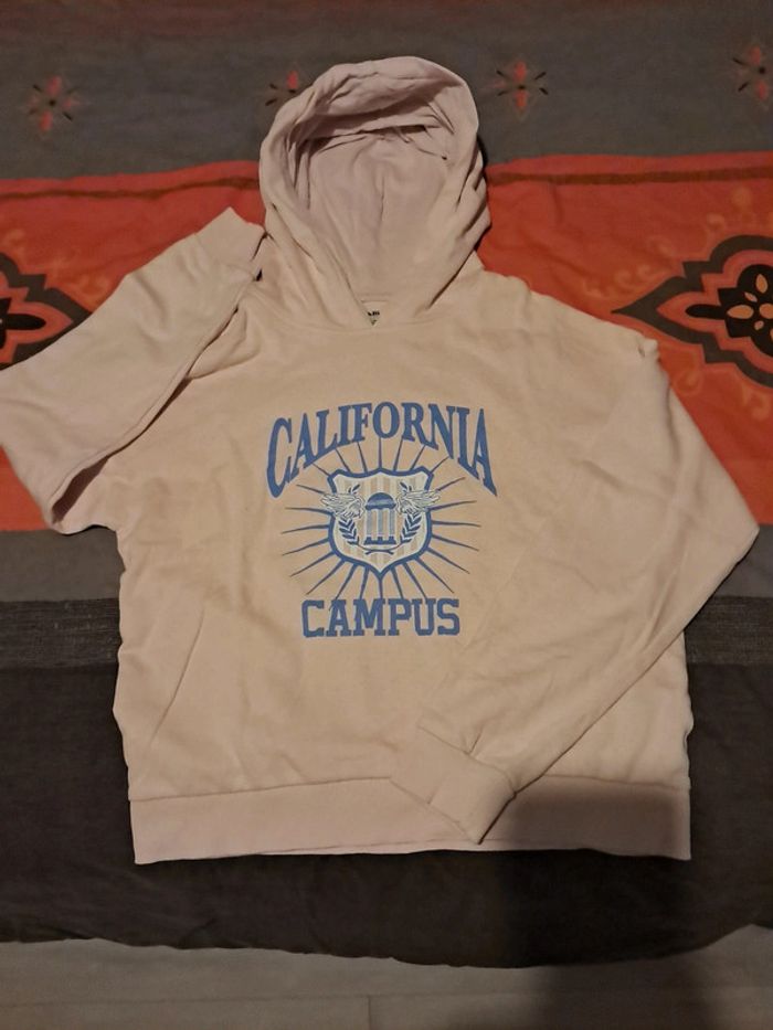 Sweat-shirt à capuche, arrive un peu en dessous du nombril. Taille XXS, equivaut à un 32, marque kiabi. Très bon état.