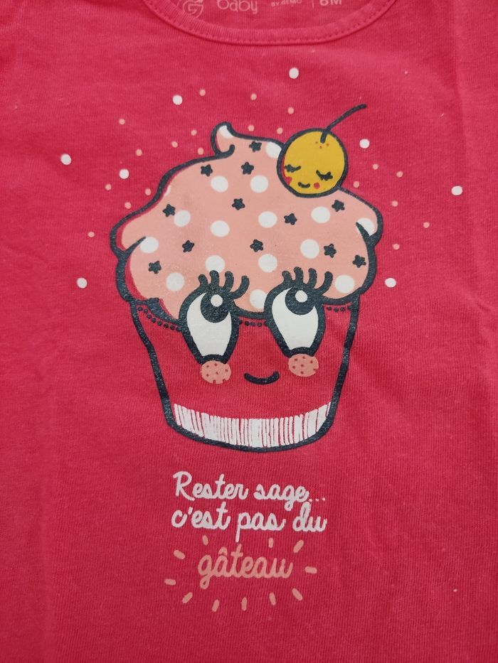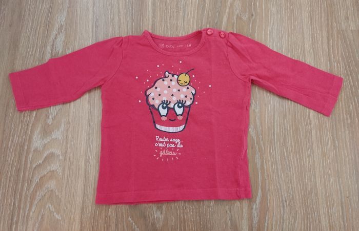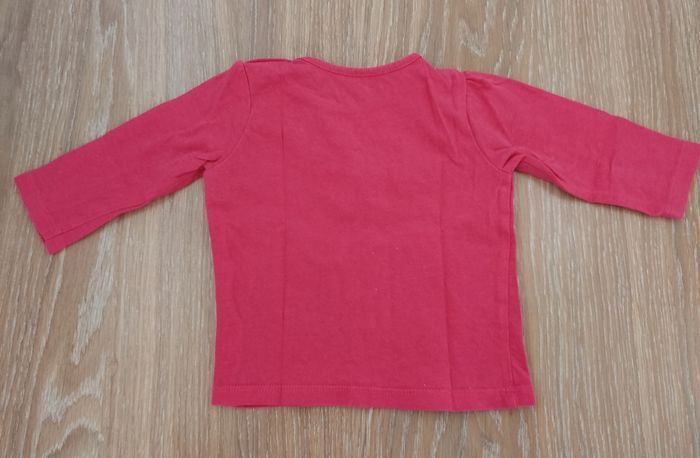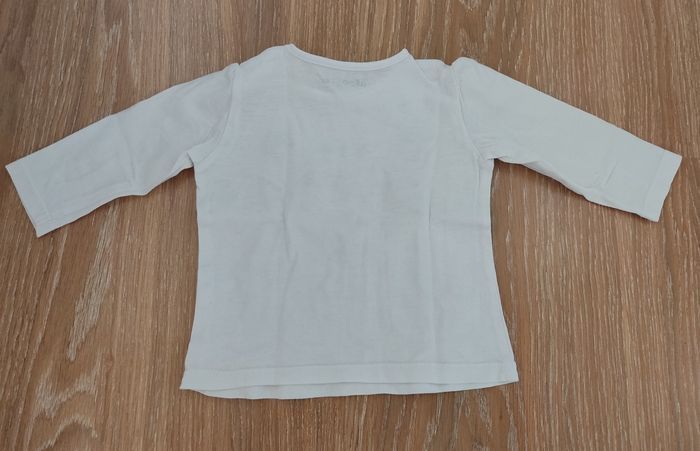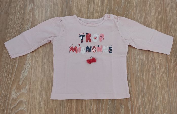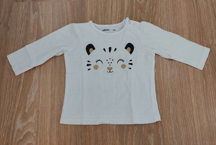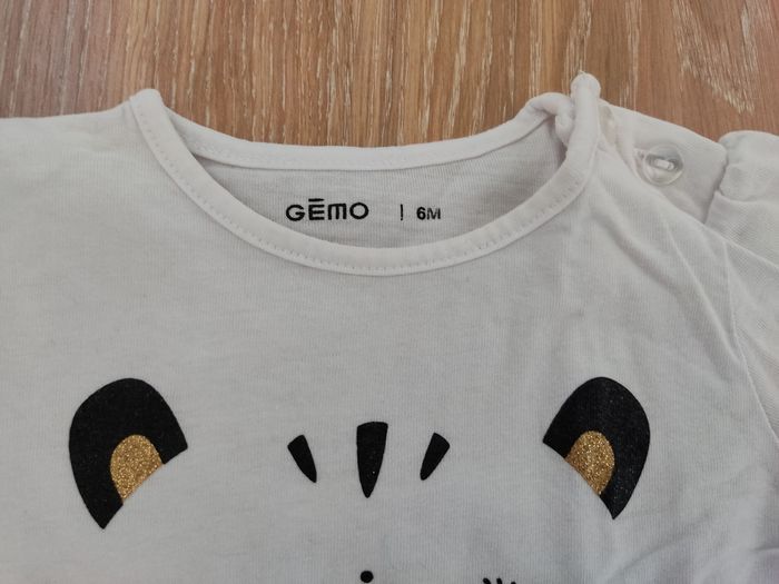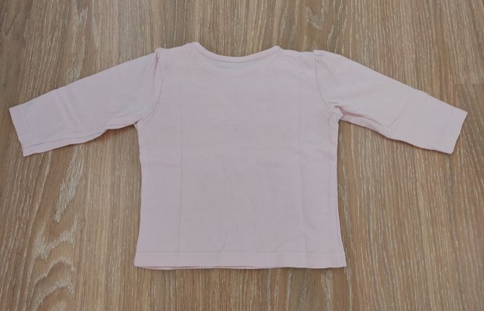 Lot de trois tee-shirts manches longues. Les deux rose sont en très bon état. Le blanc aussi, il a juste le col qui a légèrement jauni. Marque Gémo. Taille 6 mois