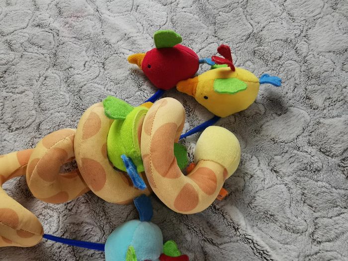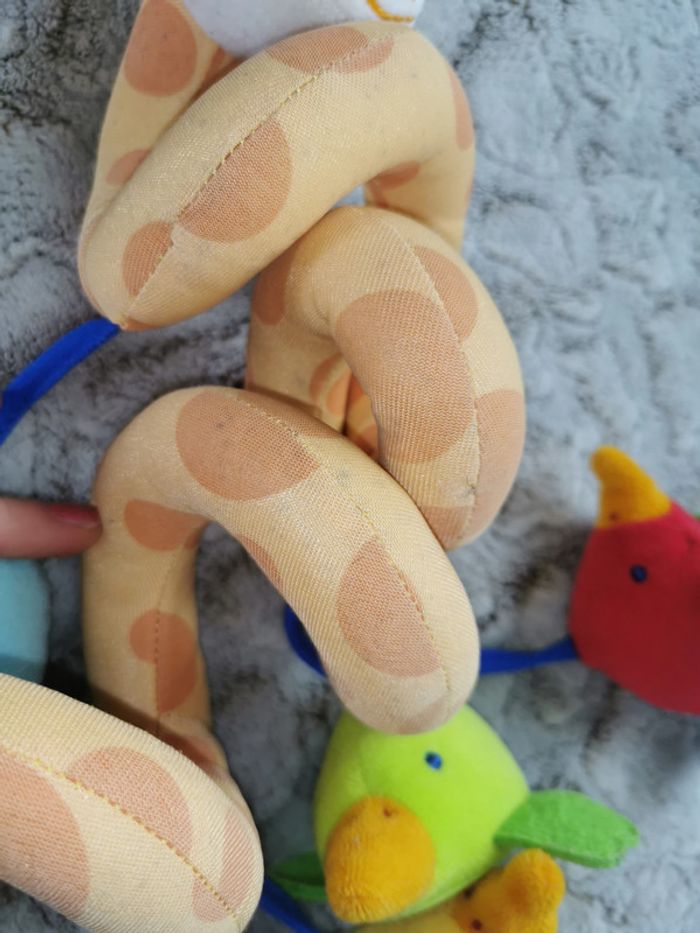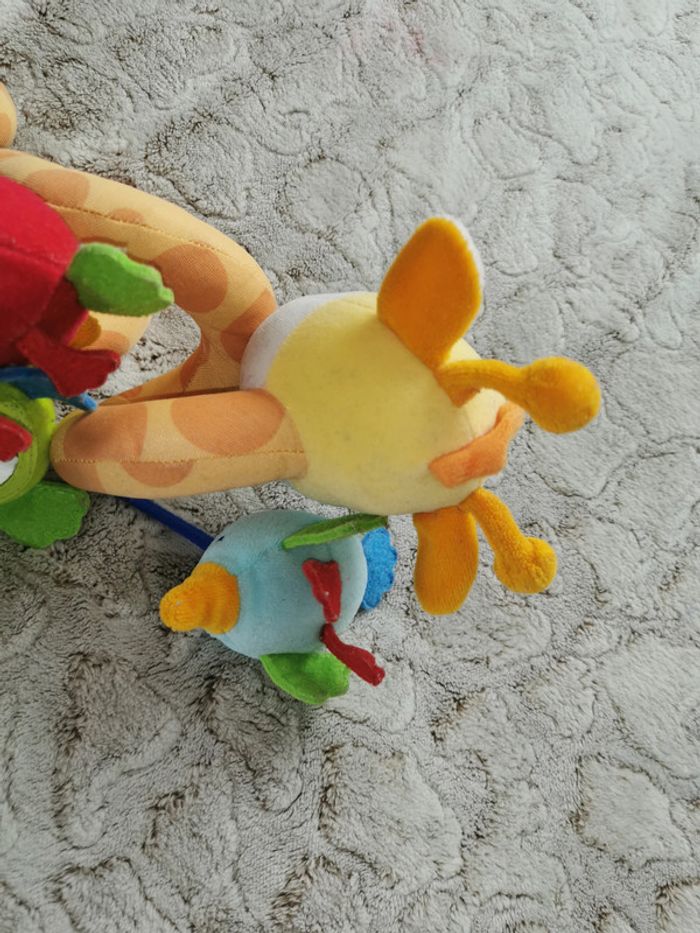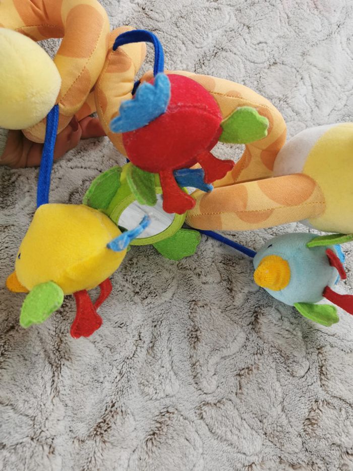 Jouets peluches oiseaux- hochets de poussette. La girafe est tachée, mais ce n'est pa strès visible (a été lavé), pour le reste est en très bon état, donc bon état général de l'ensemble, poids 185g. #hochetpoussette #jouetpoussette #peluchepoussette