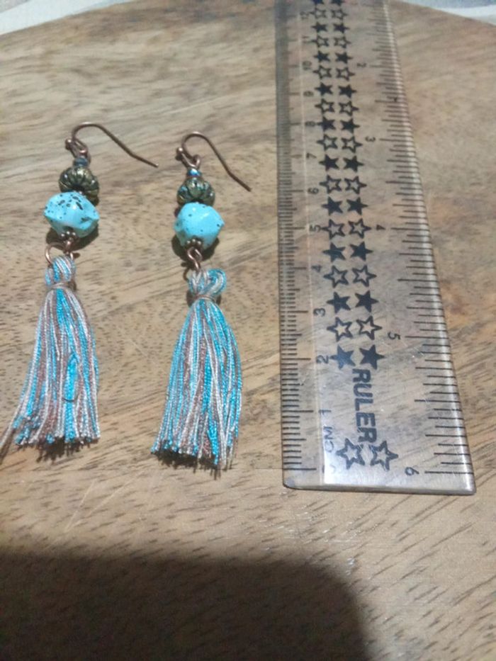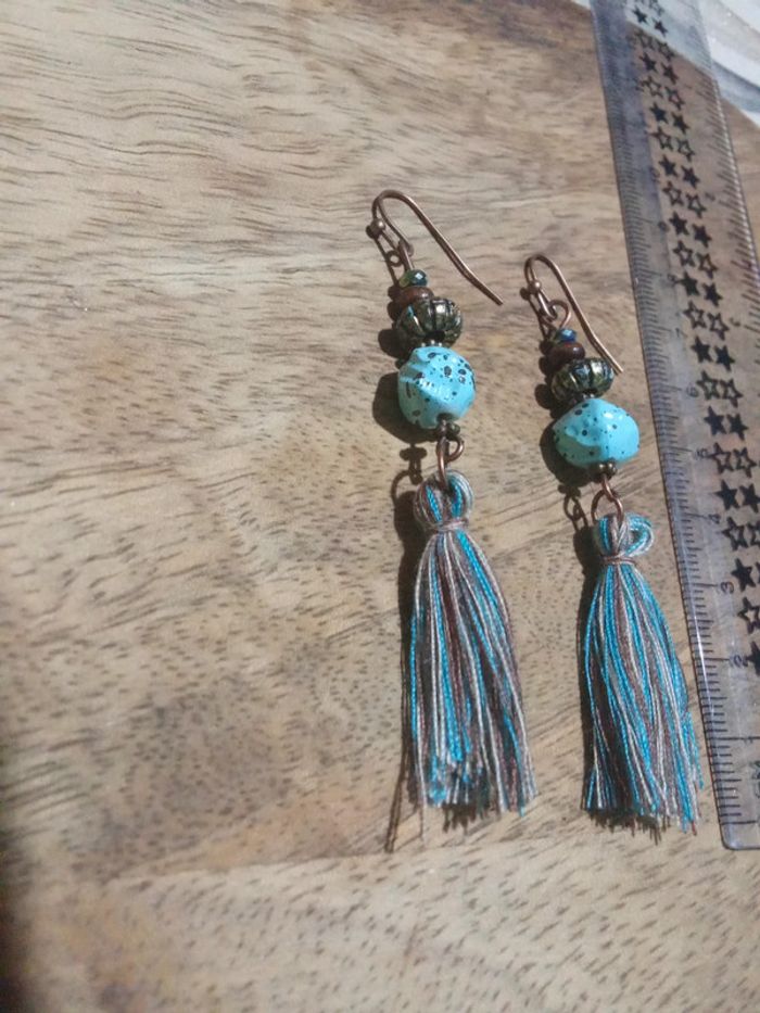 Boucles d'oreilles pendantes style turquoise et fils en tissu - photo numéro 4