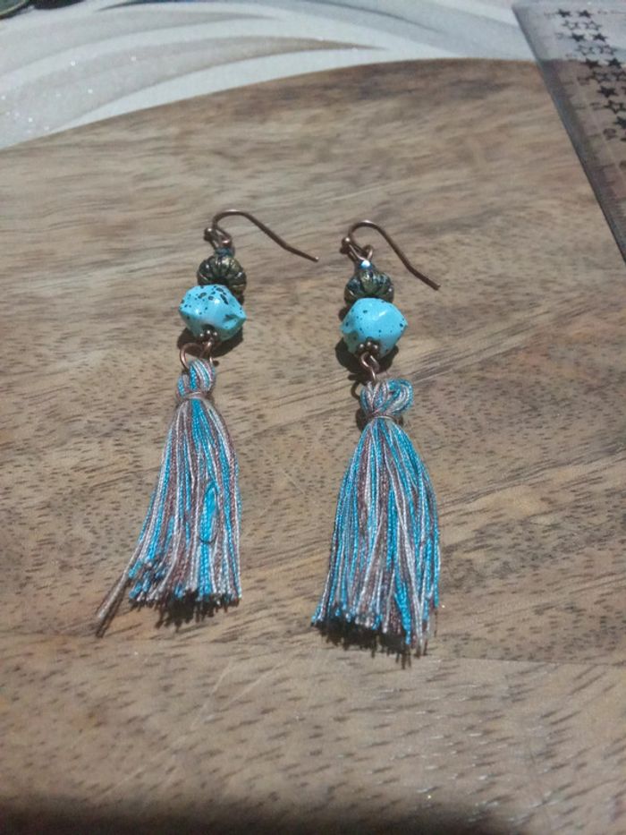 Boucles d'oreilles pendantes style turquoise et fils en tissu - photo numéro 1