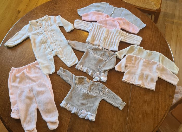 Photo 1 : 10 bodies petit bateaux et 4 bodies marques diverses Photo 2 : 8 pyjamas velours et 2 pantalons velours Photo 3 : 11 pyjamas en coton Photo 4 : 7 gilets laine, 2 pantalons laine et 1 pyjama laine Photo 5 : 4 t-shirt coton, 1 pantalon coton, 1 pull jupe Photo 6 : une combi velours à capuche Photo 7 et 8 : 1 turbulette velours
