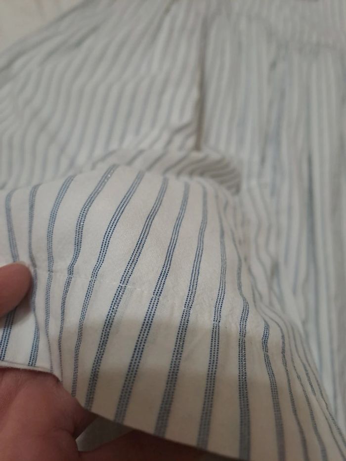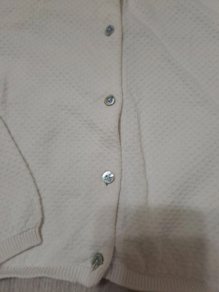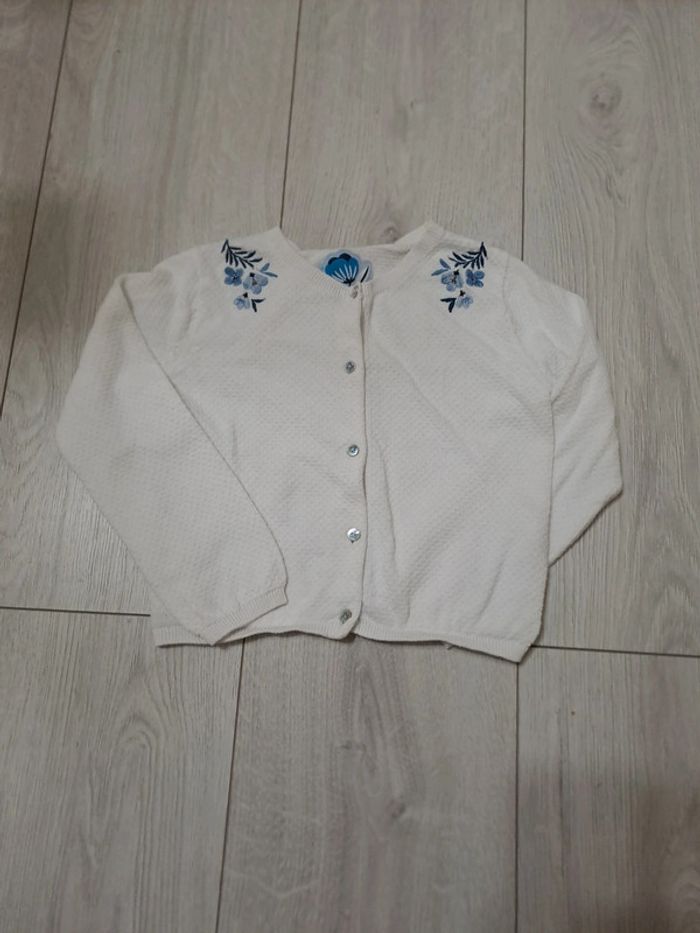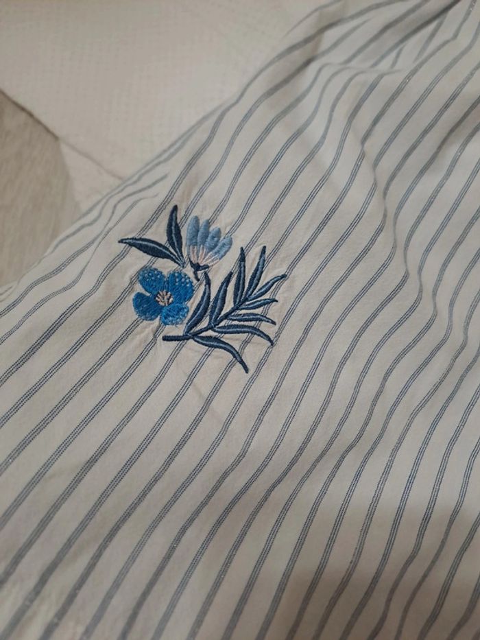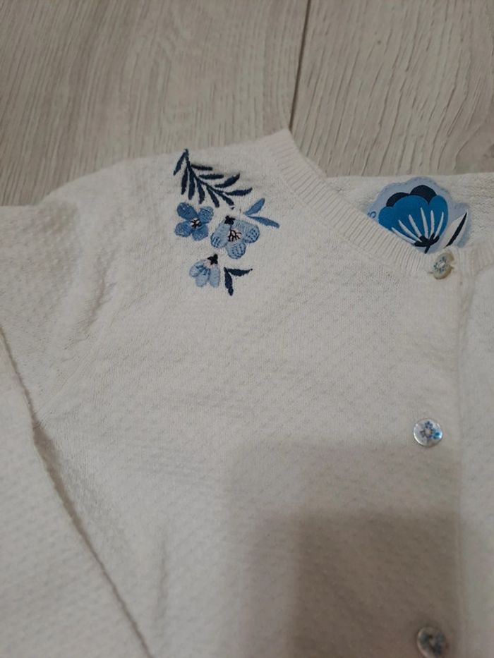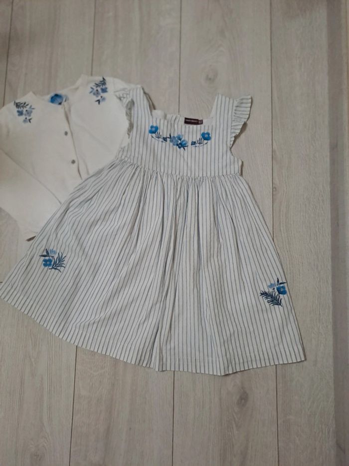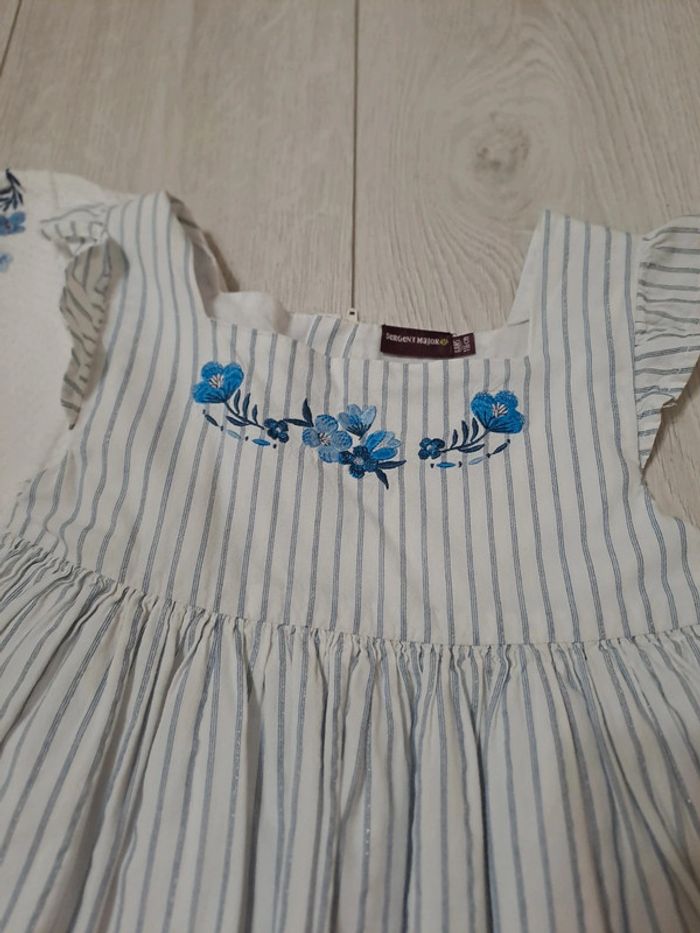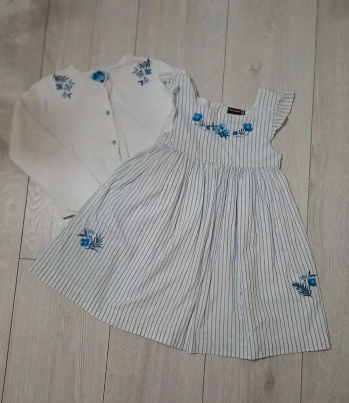 Ensemble de cérémonie 6A. État comme NEUF Robe blanche à fines rayures bleues et métallisées. Broderies fleuries bleues. Gilet blanc éclatant 6A assorti. Broderies bleues aux epaules. Boutons fleuris nacrés