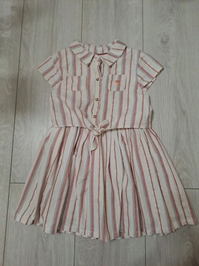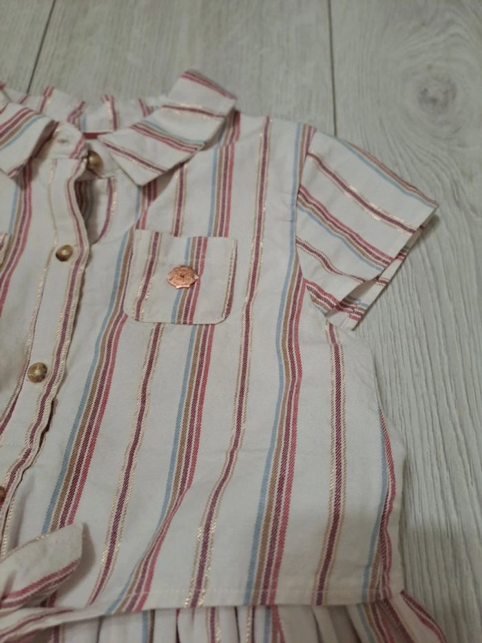 Robe elegante 6A. État comme NEUF Été 2024 Beige à rayures verticales rosées. Lignes métallisées sublimes. Petites poches et nœud à nouer devant