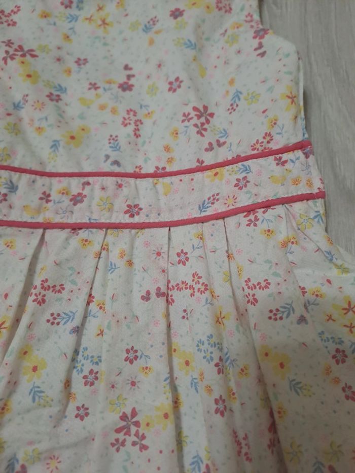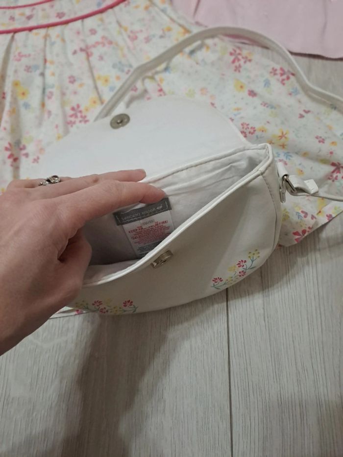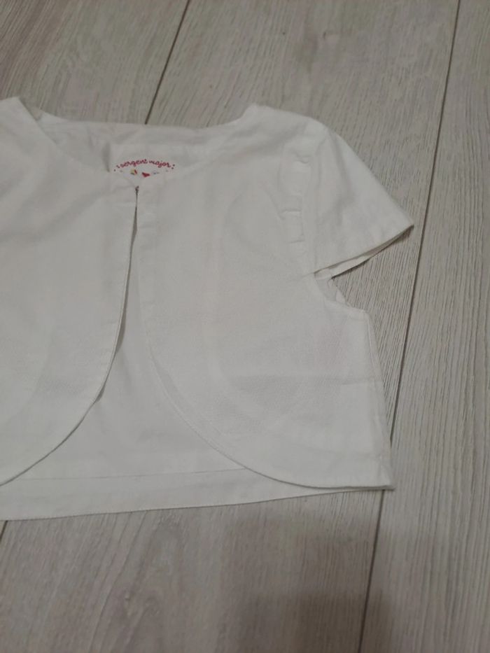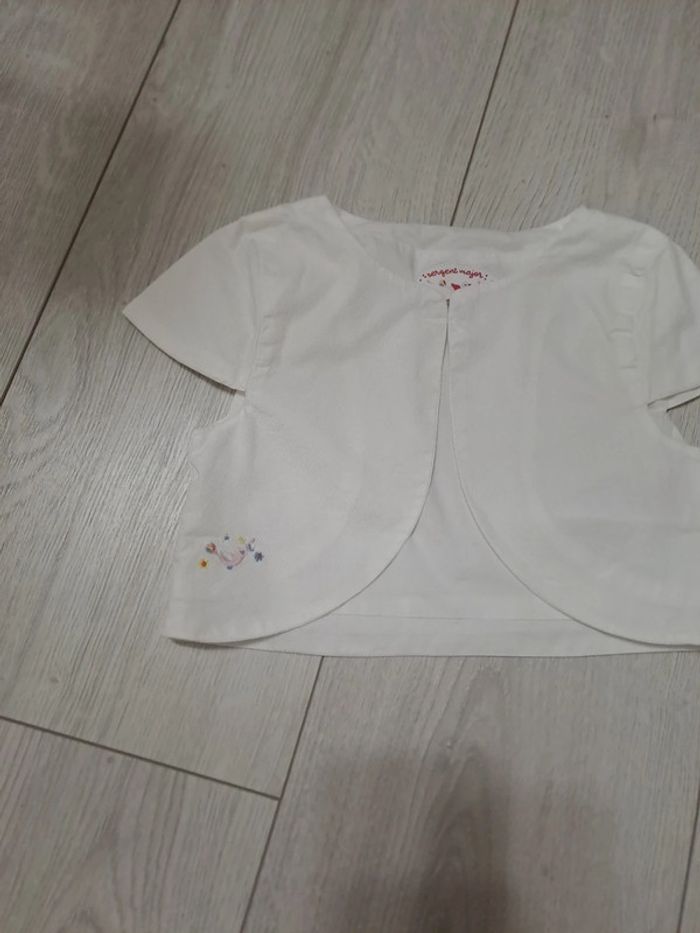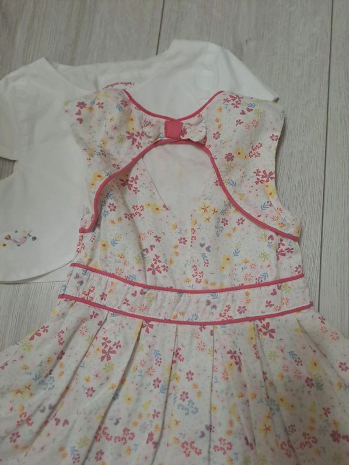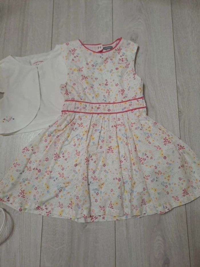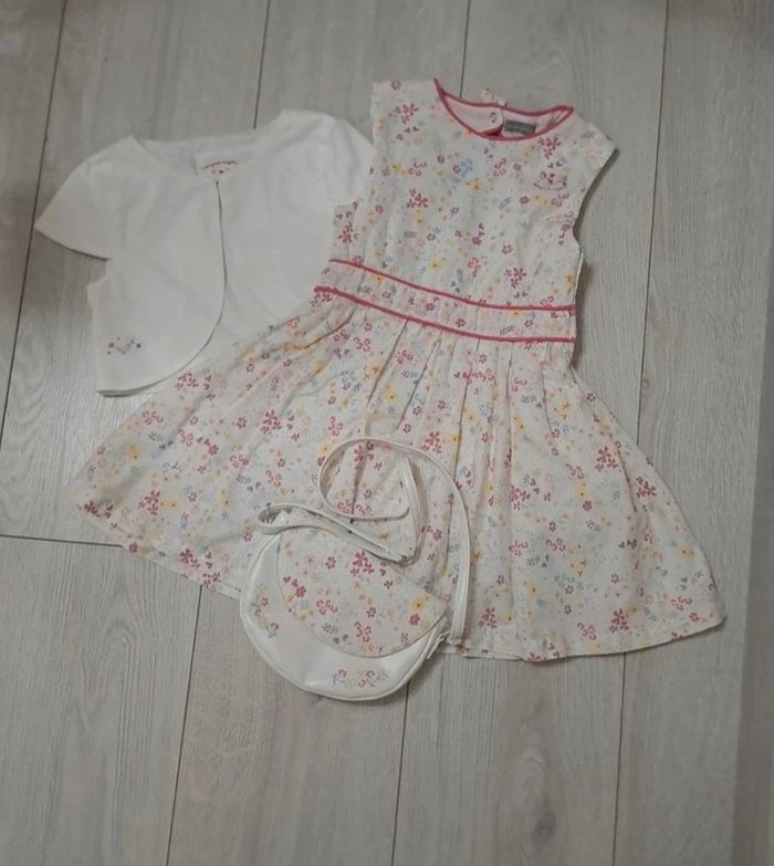 Ensemble de cérémonie excellent état (porté 1 fois) "Ballade dans les nuages" - Robe crème motif fleuri rose/jaune/bleu. Joli dos ajouré avec petit noeud. A noter une légère decoloration rose au niveau des bordures rose de la taille. - Boléro sans manche 6A blanc assorti. Oiseau brodé Le sac assorti en vente 12 euros dans mon dressing!