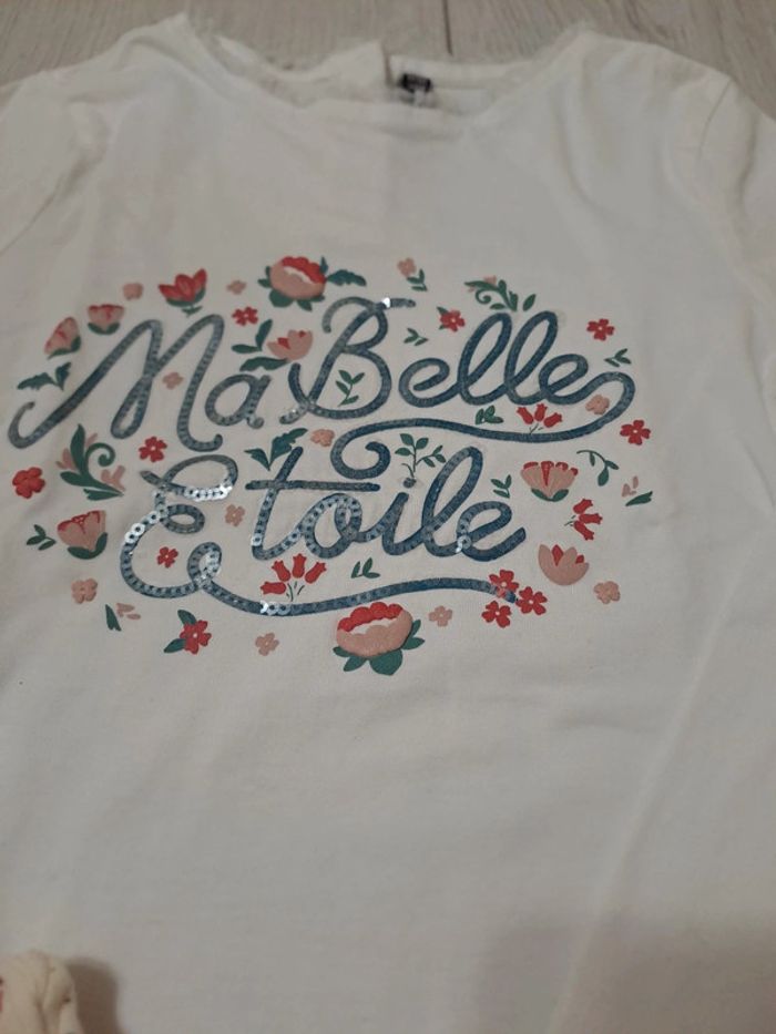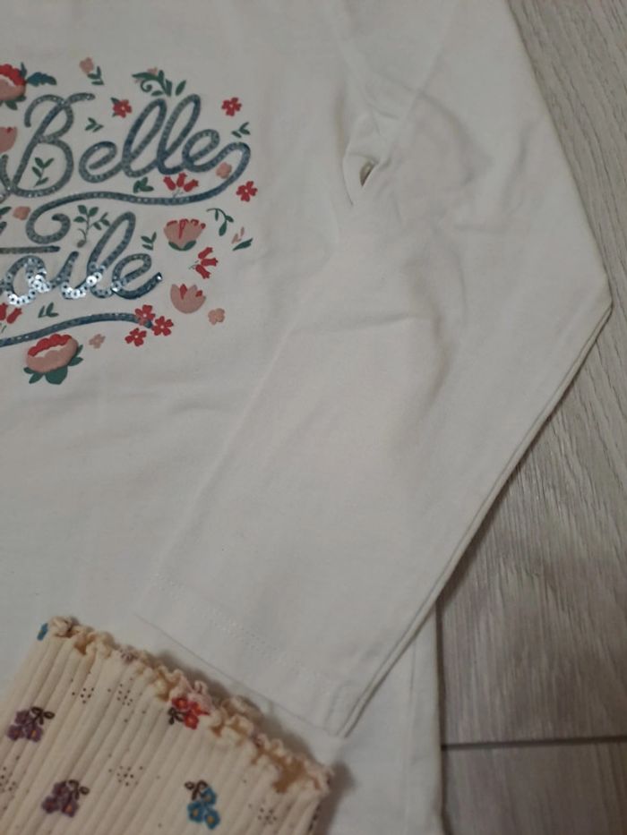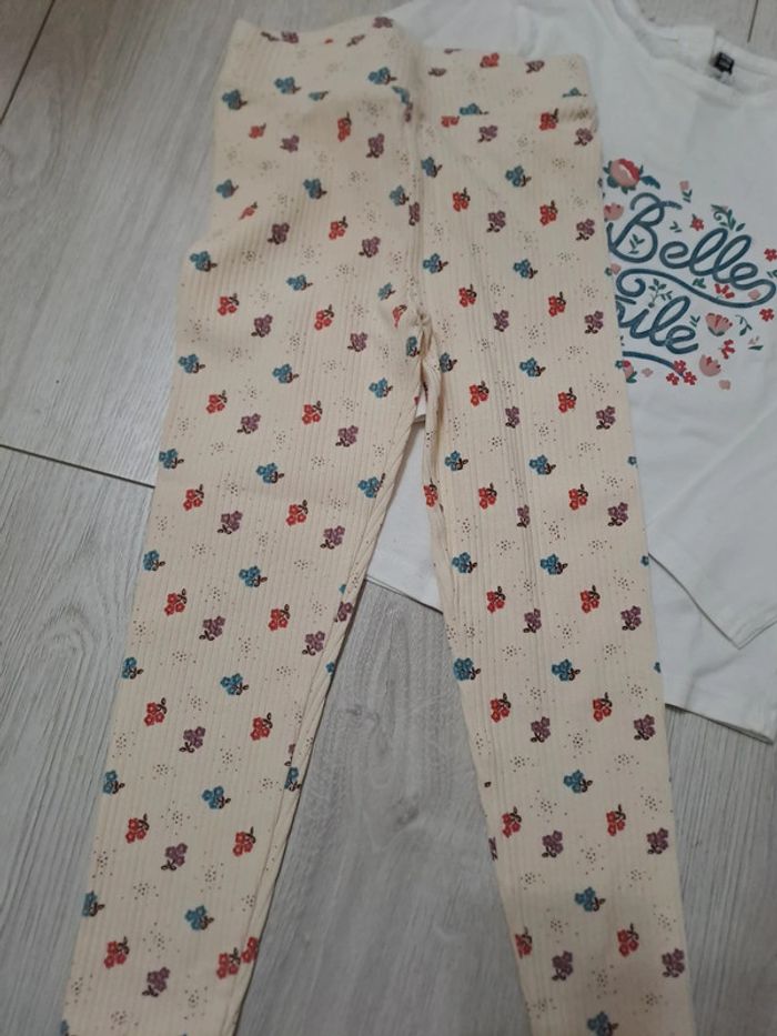 Ensemble 5/6A état comme NEUF - legging crème 4/5A imprimé fleuri turquoise/rouge. - tee shirt blanc 6A. Inscription turquoise. Sequins transparents. Fleurs r