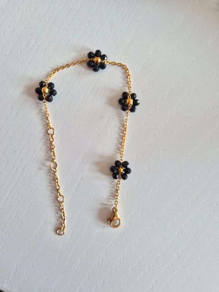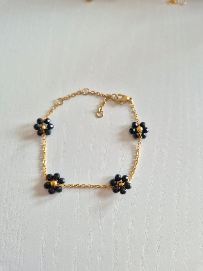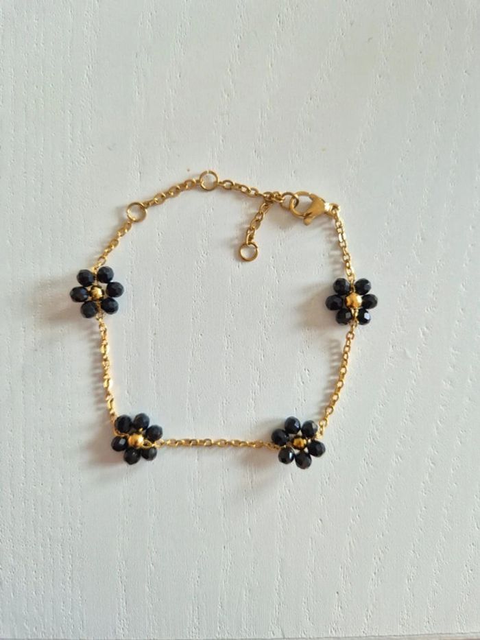 Bracelet estivale dorée or en acier inoxydable avec fleurs de perles noires NEUF style gigi - photo numéro 1