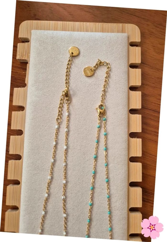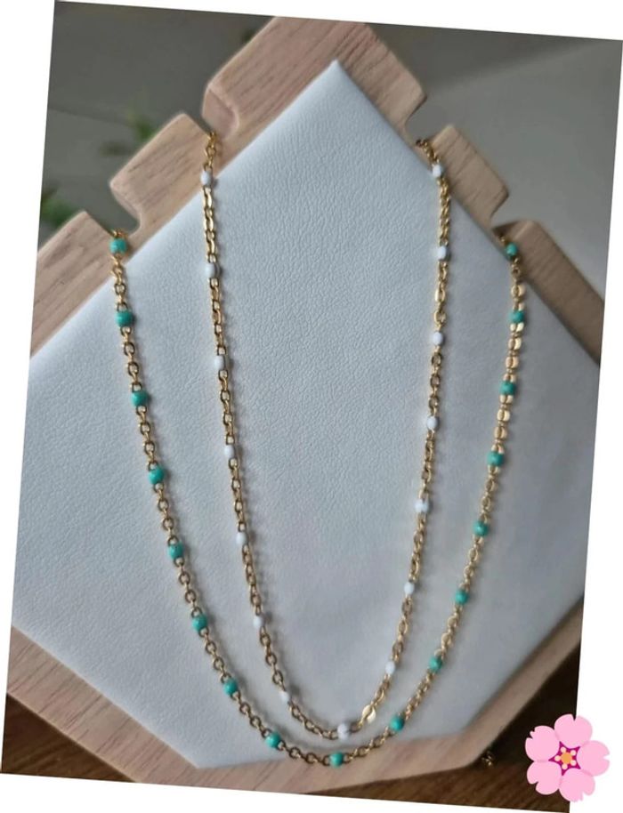 2 Colliers style gigi tour de cou dorée acier inoxydable perles Turquoise et blanc 🌸 35 cm à 41 cm - photo numéro 4