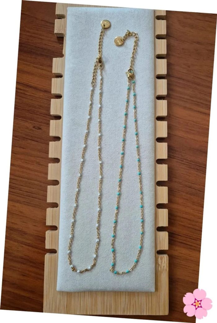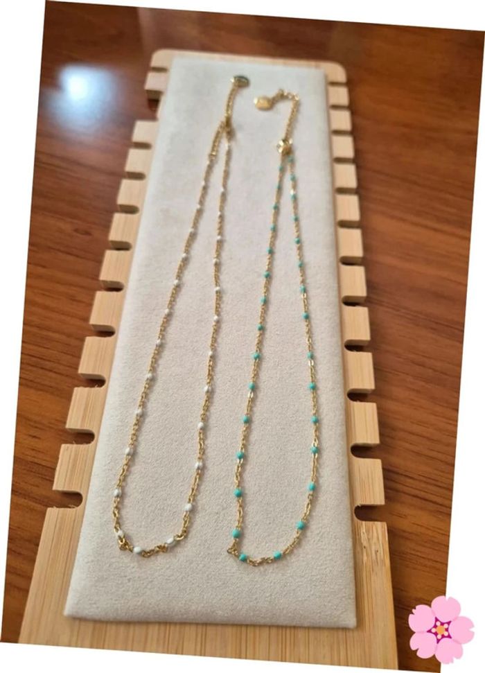 2 Colliers style gigi tour de cou dorée acier inoxydable perles Turquoise et blanc 🌸 35 cm à 41 cm - photo numéro 3