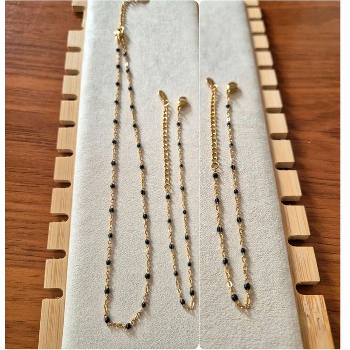 Lot de 3 bijoux :  1 collier et 2 bracelets dorée or en acier inoxydable NEUF 🌸 perles noir noires