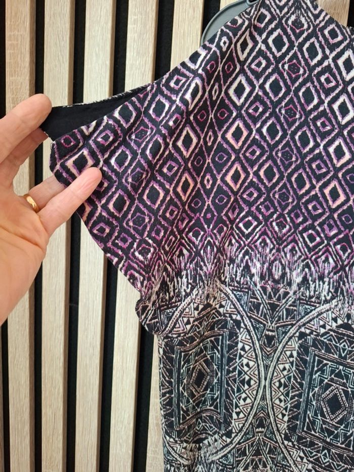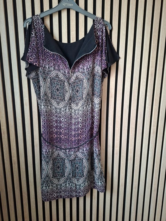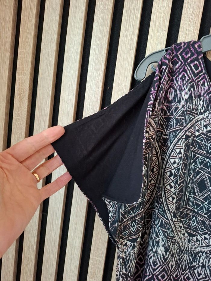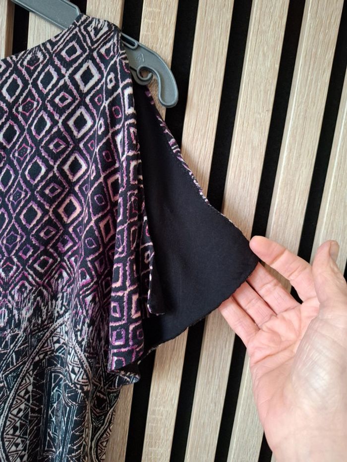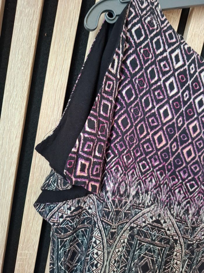 Robe fluide imprimée dans les tons de noir et violet Entièrement Doublée Épaules dénudées Aisselles 52cm /Longueur 95 cm Passants pour ceinture,ceinture cordon noir Vendue avec la robe . N hésitez pas à visiter mon profil et laissez vous guider par mes différents # #clementine13430femmest38