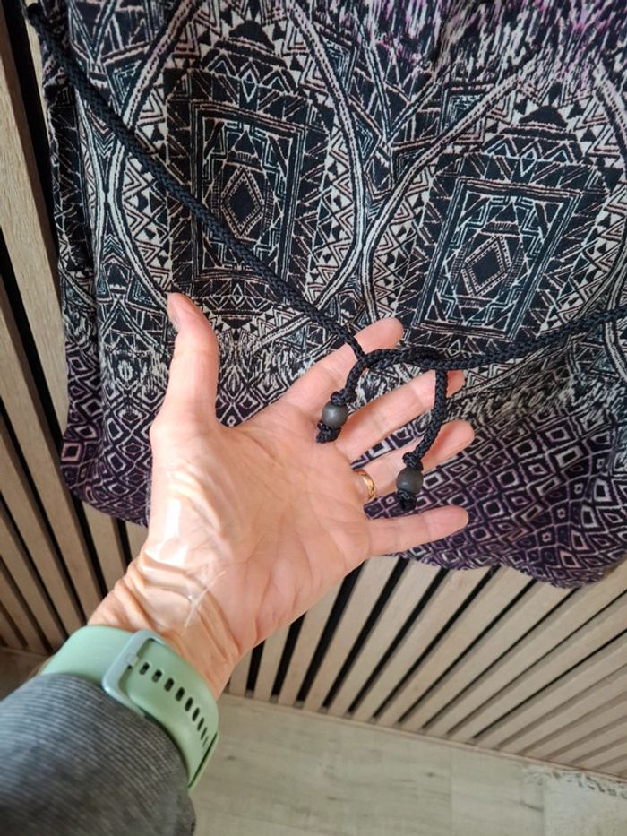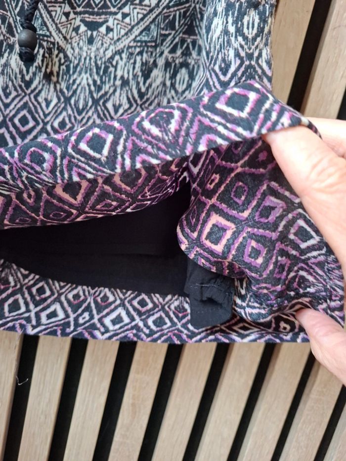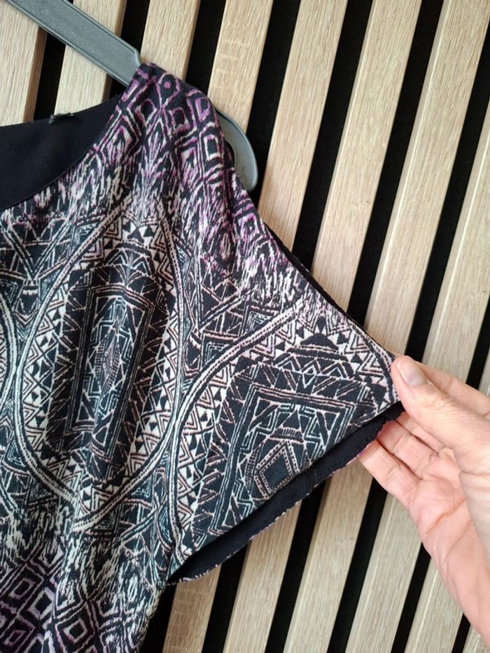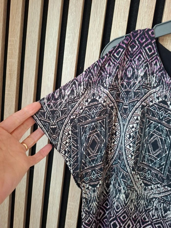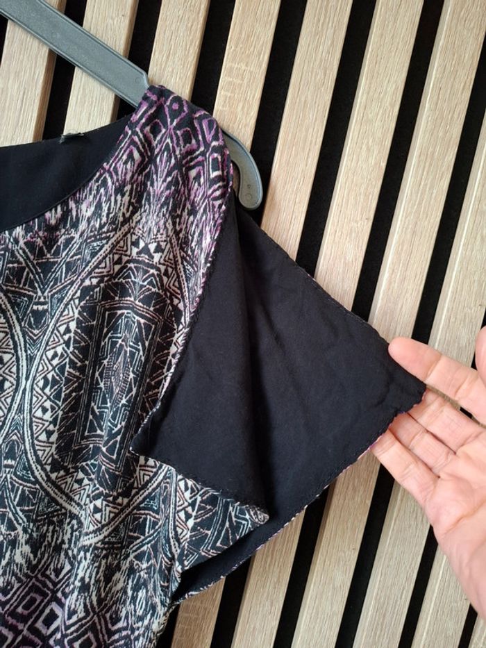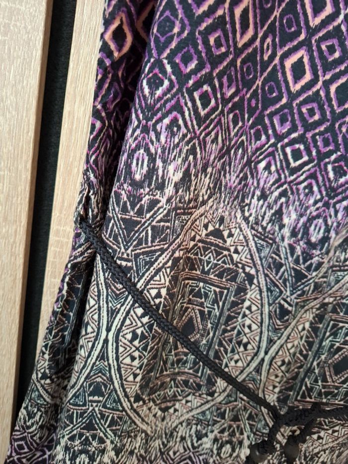 Robe fluide imprimée dans les tons de noir et violet Entièrement Doublée Épaules dénudées Aisselles 52cm /Longueur 95 cm Passants pour ceinture,ceinture cordon noir Vendue avec la robe . N hésitez pas à visiter mon profil et laissez vous guider par mes différents # #clementine13430femmest38