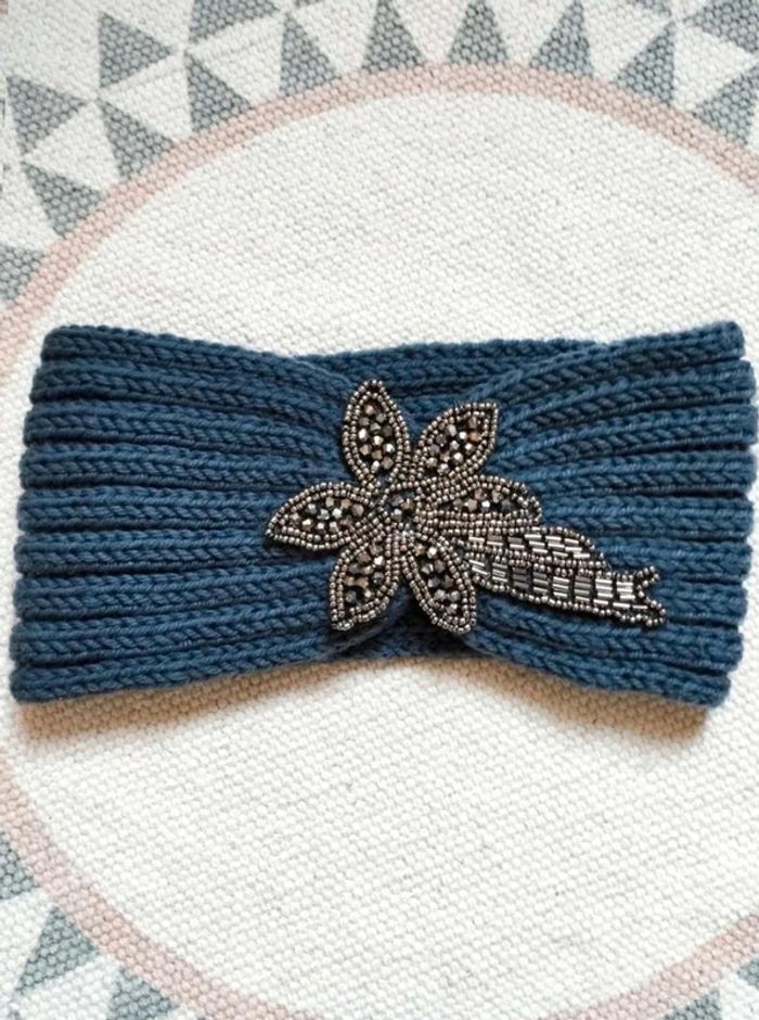 Bandeau cache oreilles hiver - Maille bleu-gris - fleur perles - Neuf