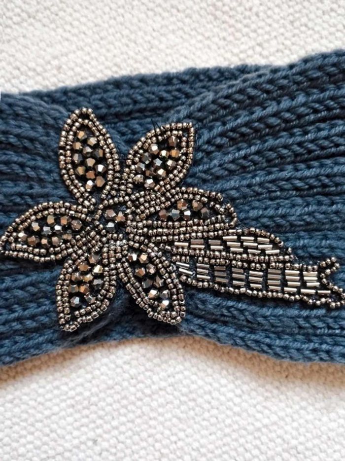 Bandeau  cache  oreilles  hiver  -  Maille  bleu-gris  -  fleur  perles -  Neuf